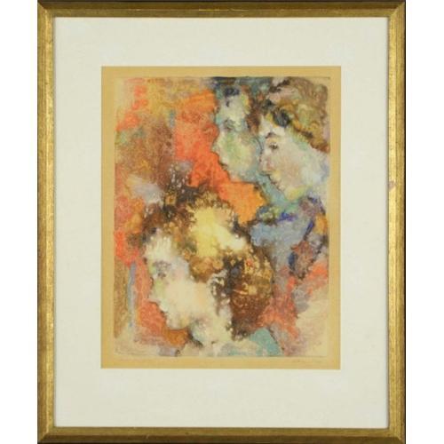 This is a very impressionistic painting of three female profiles. The colors of this piece jump at you. The bright blues and greens are accented by the reds and oranges. A very attractive style of painting is used. The colors blend with one another, never mudding up simply flowing from green to purple to red. This stunning piece is accentuated by the neutral white mat and gold colored, slim wood frame. The piece itself is 13.5