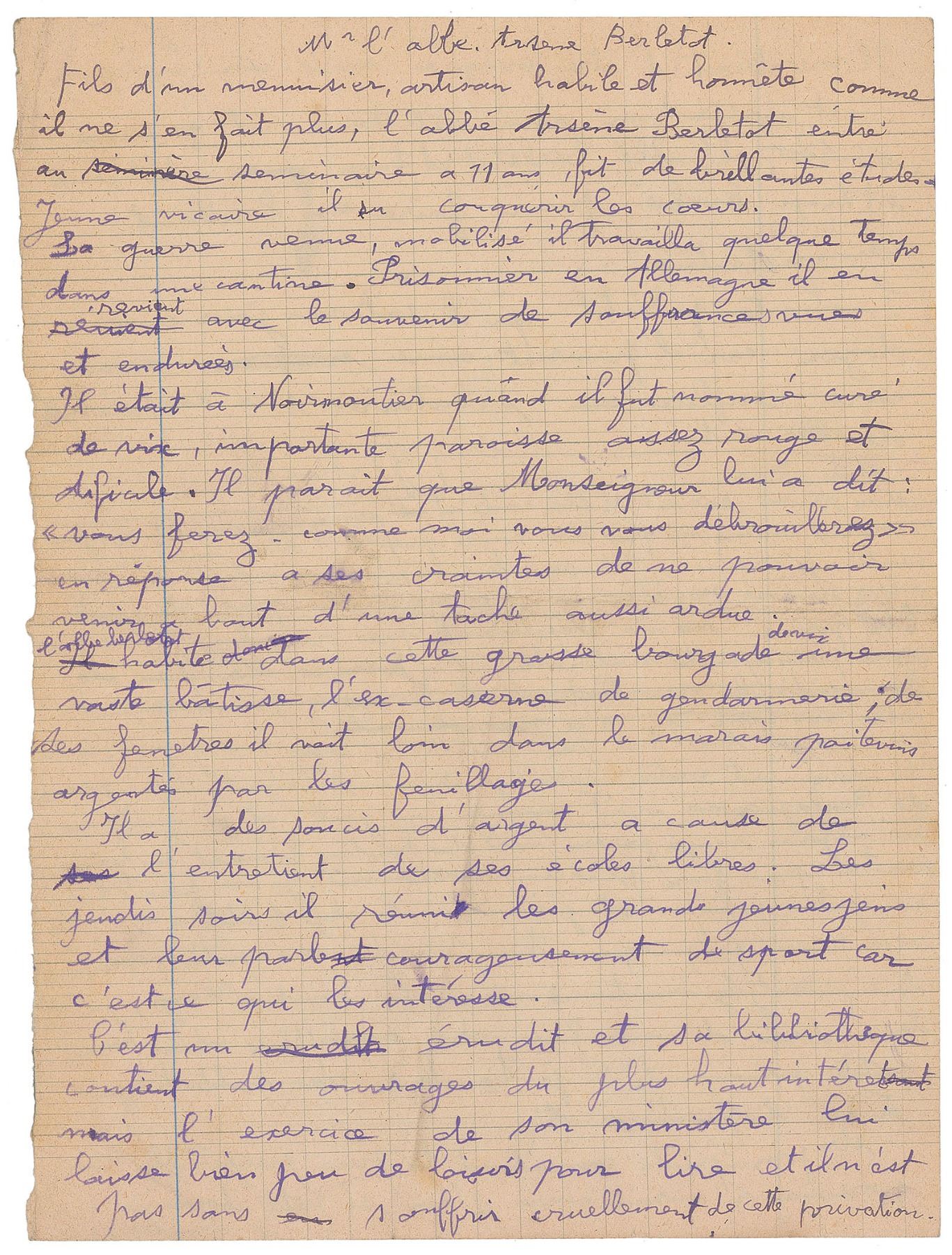 French painter (1910–1964) who described his style as 'modern rustic' and enjoyed the company of the artistic and intellectual elite of his day. Handwritten drafts in French for two different pieces, each signed at the conclusion "G. Chaissac," one gridded page both sides, 6.5 x 8.75, no date but circa 1946. The first describes a priest, Father Berletot, who entered the seminary at age eleven and was appointed as pastor of an important parish. This passage, in part (translated): "He deserves to be a bishop but a bishop is also a director and Father Berletot is too intellectual and too evolved to be a brilliant administrator. Rather he wants to be a senior priest because he could have a beneficial influence on the priests of his district." The second text was published in the third issue of Centres, a magazine founded in Limoges by Rene Rougerie. In part (translated): "My dream would be to be a count and have a county, because I'd rather not be count without a county…Being prince I would not mind either, a prince with a principality naturally. As I am very ambitious with a little principality of two hundred square meters I would be satisfied. Prince de Boulogne would fit like a glove and I would wear a blue Persian uniform with faux buttons to make it more impressive…My principality would experience everlasting peace because no one would want such a small field." In fine condition, with a few trivial stains.
