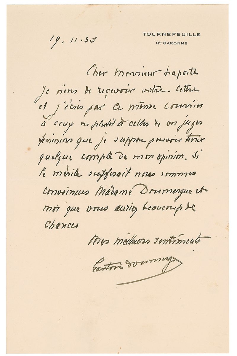 French politician of the Third Republic (1863–1937). ALS in French, one page, 5.25 x 8.25, Tournefeuille letterhead, November 19, 1935. Letter to Monsieur Laporte. In full (translated): “I have just received your letter and I am writing to those Ladies from the Jury whom I believe I can influence. If only merit was under consideration, Mr. Doumergue and myself are convinced you would stand a great chance. All our very best.” A central horizontal fold, some scattered light soiling, and a few creases, otherwise fine condition.