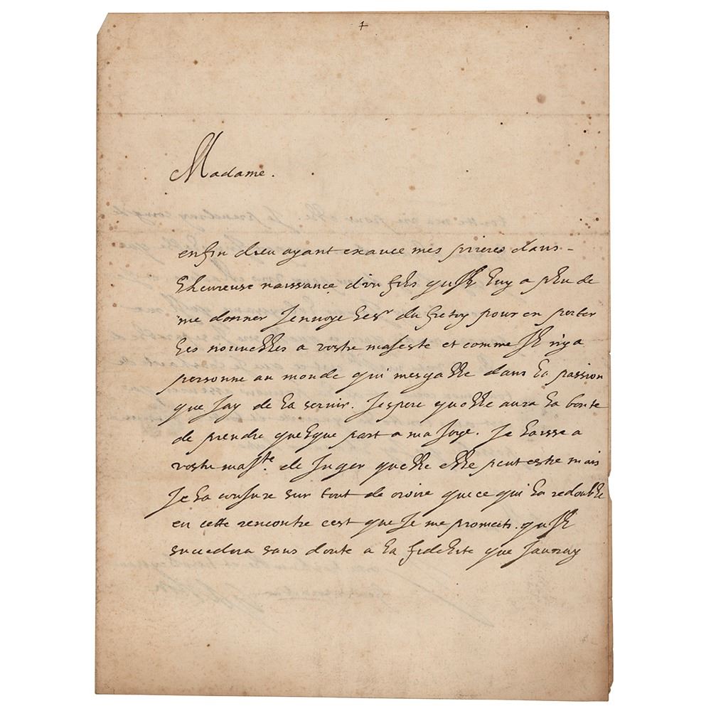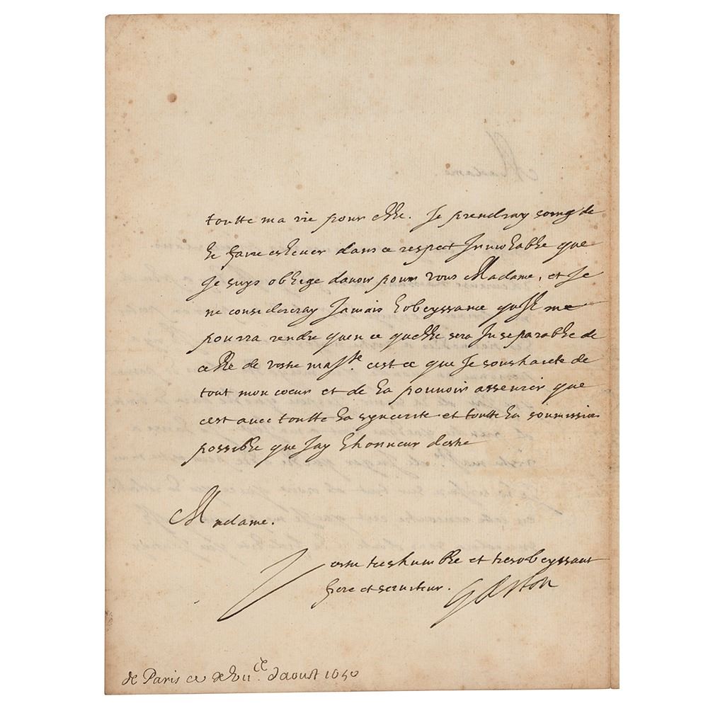 Third son (1608–1660) of King Henry IV of France and his wife Marie de' Medici, and brother of King Louis XIII; remembered for his frequent quarrels with his brother and Cardinal Richelieu. ALS in French, signed “Gaston,” one page both sides, 6.5 x 9, August 17, 1650. Handwritten letter by the Duke of Orleans, announcing to the Queen Regent, Anne of Austria, the birth of a son, and protesting his fidelity towards her. Addressed on the reverse, "A la Reyne." In fine condition, with minor scattered foxing. The birth of Gaston's only son, Jean Gaston, Duke of Valois, was greatly celebrated by his older half-sister, Anne Marie Louise, 'la Grande Mademoiselle,' who ordered a large fireworks display in Paris to celebrate his birth. The little boy sadly passed away at the age of two at the Palais d'Orléans.