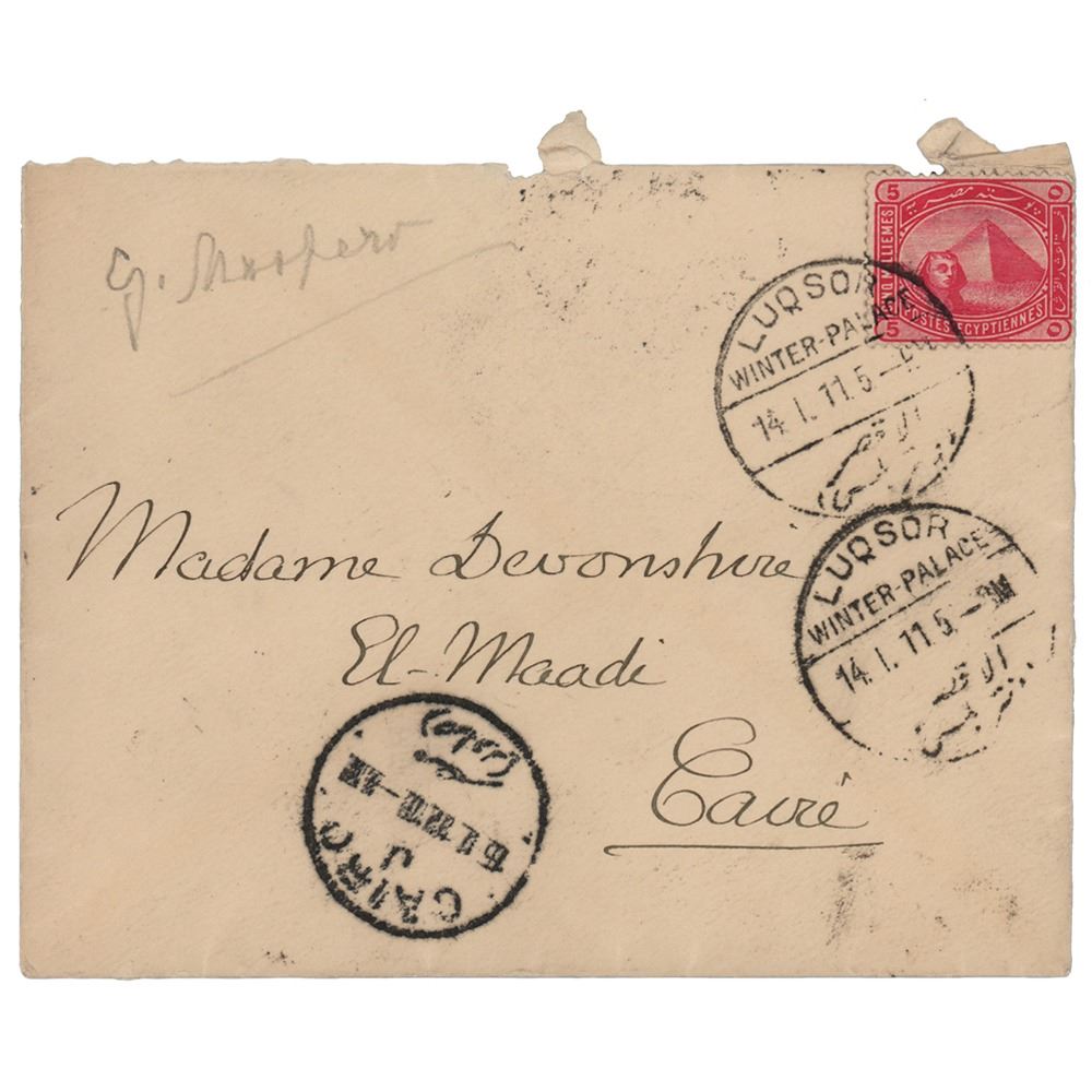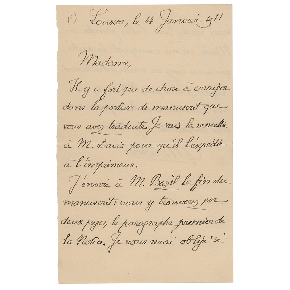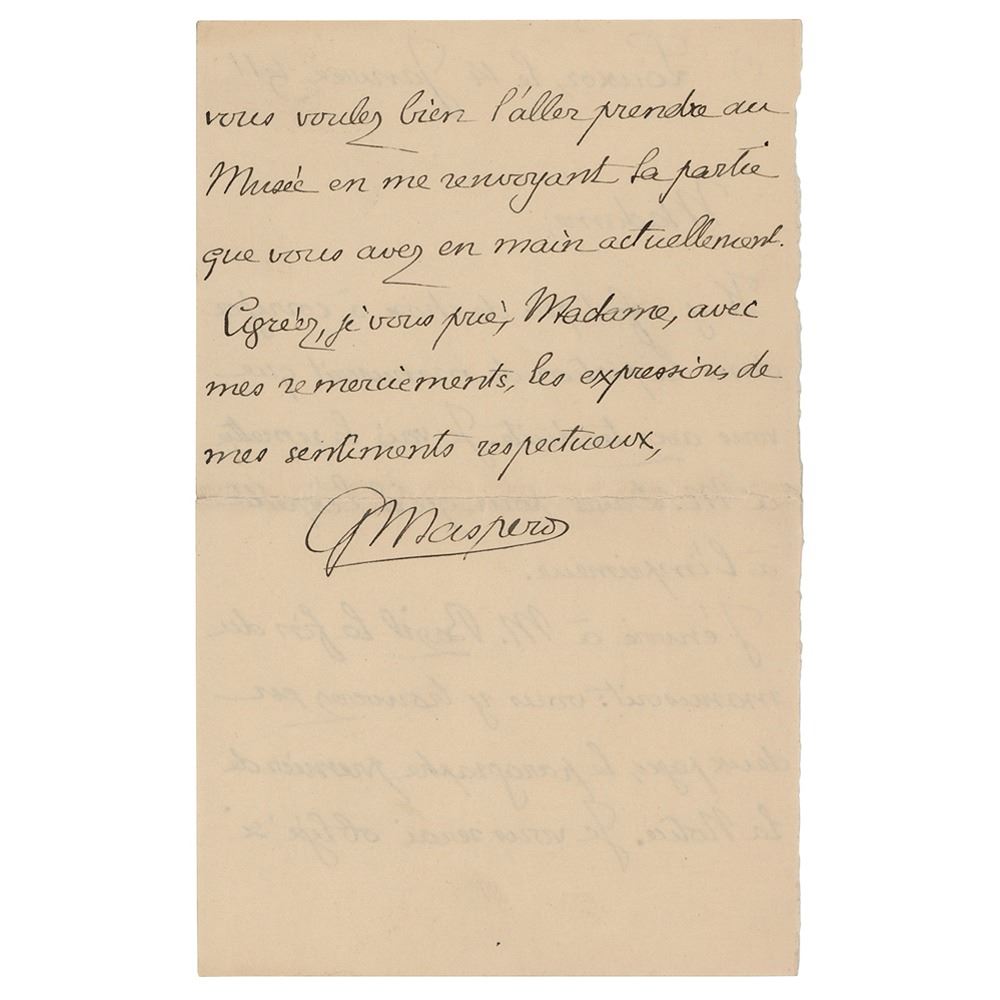 Egyptologist (1846–1916) known for his studies of hieroglyphics and archaeological excavations. ALS in French, signed “G, Maspero,” one page both sides, 4.5 x 7, January 14, 1911. Untranslated handwritten letter by Maspero. In fine condition. Accompanied by the original mailing envelope, addressed in his own hand.