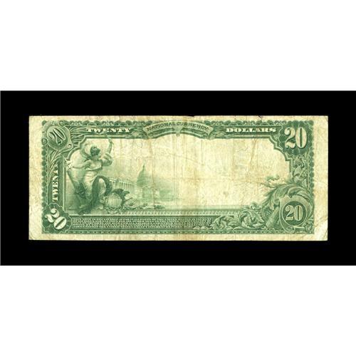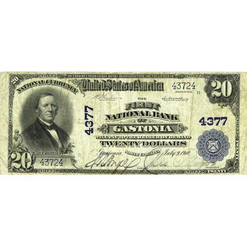 <B>Gastonia, NC</B></I> - $20 1902 Plain Back Fr. 653 <B>The First NB</B></I> Ch. # 4377<BR>This was the first of three issuers chartered here. Like the other two, it fell victim to the depression, outlasting its competitors until 1935. This <B>Very Fine</B></I> $20 Plain Back has ample margins all around and retains legibly stamped signatures. This is also the variety with two bank serial numbers.