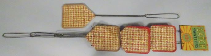 Gatch Swatters Tin Litho Store Display Hanger. Comes with 4 woven fly swatters. Excellent condition. 20 inches tall.