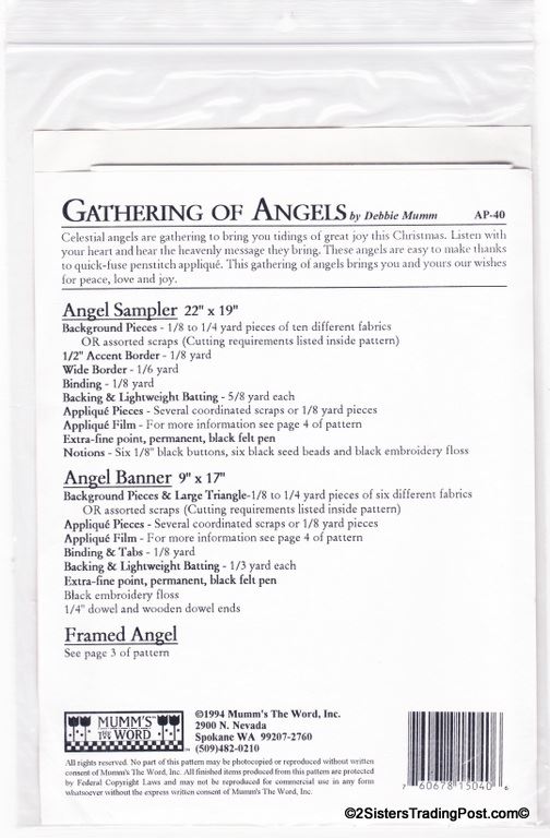 Pattern 'Gathering of Angels' by Debbie Mumm for Mumm's the Word. Pattern includes instruction for sampler 22" x19", banner 9" x 17" & framed angel. MSRP $6.99