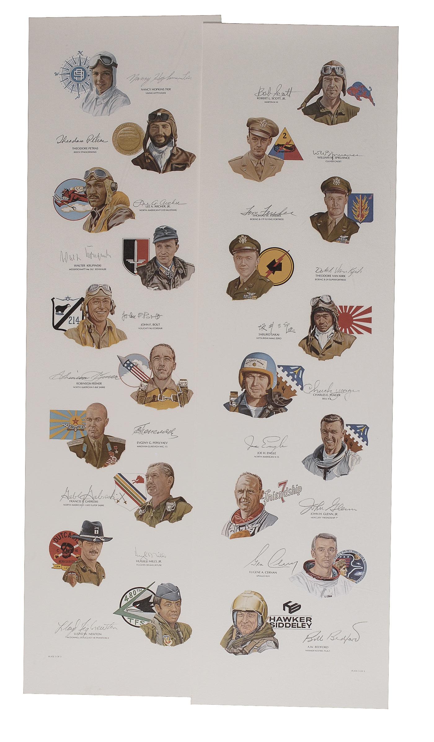 Three piece color limited edition lithograph set, one 16.5 x 26 and two 7.5 x 26 from the Gathering of Eagles 1995, numbered #31/1000. Two smaller prints are signed in pencil by the following aviators, each signing by his image: Nancy Hopkins Tier, Theodore Petras, Lee Archer, Walter Krupinski, John Bolt, Robinson Risner, Yevgeny Pepelyaev, Gabby Gabreski, Hugh Mills, Lloyd Newton, Bob Scott, William Spruance, Tom Ferebee, Dutch Van Kirk, Saburo Sakai, Chuck Yeager, Joe Engle, John Glenn, Gene Cernan, and Bill Bedford. The third composite print is signed in pencil by the artist, Mike Machat. Rolled and in fine condition.