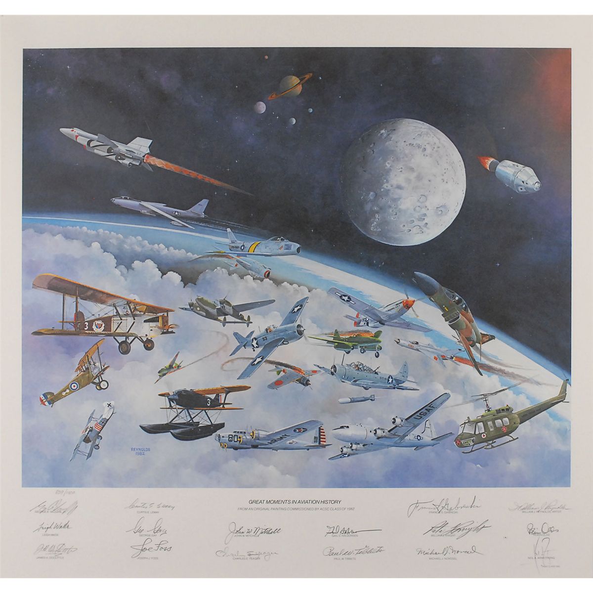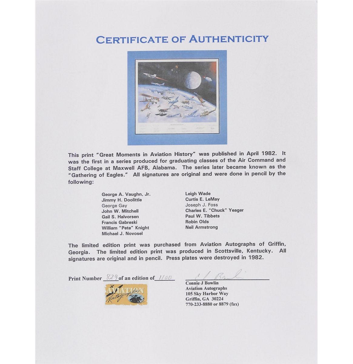 Exceptional color limited edition 25.5 x 24.5 print entitled ‘Great Moments in Aviation History,’ numbered 829/1100, signed in pencil by 15 important figures in the history of American flight: Neil Armstrong, George A. Vaughn, Jr., Leigh Wade, James H. Doolittle, Curtis E. LeMay, George Gay, Joe Foss, John W. Mitchell, Charles E. Yeager, Gail S. Halverson, Paul W. Tibbets, Frances S. Gabreski, Pete Knight, Michael J. Novosel, and Robin Olds, and also signed by the artist, William J. Reynolds. In fine condition, with extremely slight indication that it was previously rolled. Accompanied by the associated hardcover book containing brief biographies of the signers. This print was produced in conjunction with the the first ‘Gathering of Eagles' event held in 1982 at the Air Command and Staff College to promote the study of aviation history and pioneers of flight; it has remained in the private collection of one of the students responsible for developing the program ever since. Although the program's success turned it into an annual event with new prints issued on each occasion, the 1982 edition was the only to be signed by Armstrong. A scarce and sought-after piece signed by some of the most important space and aviation pioneers in history.