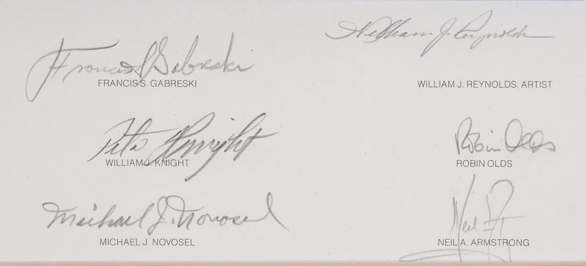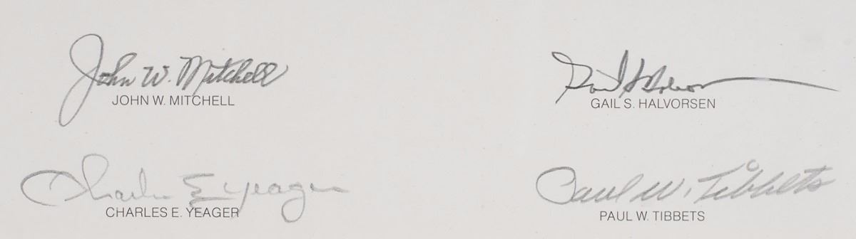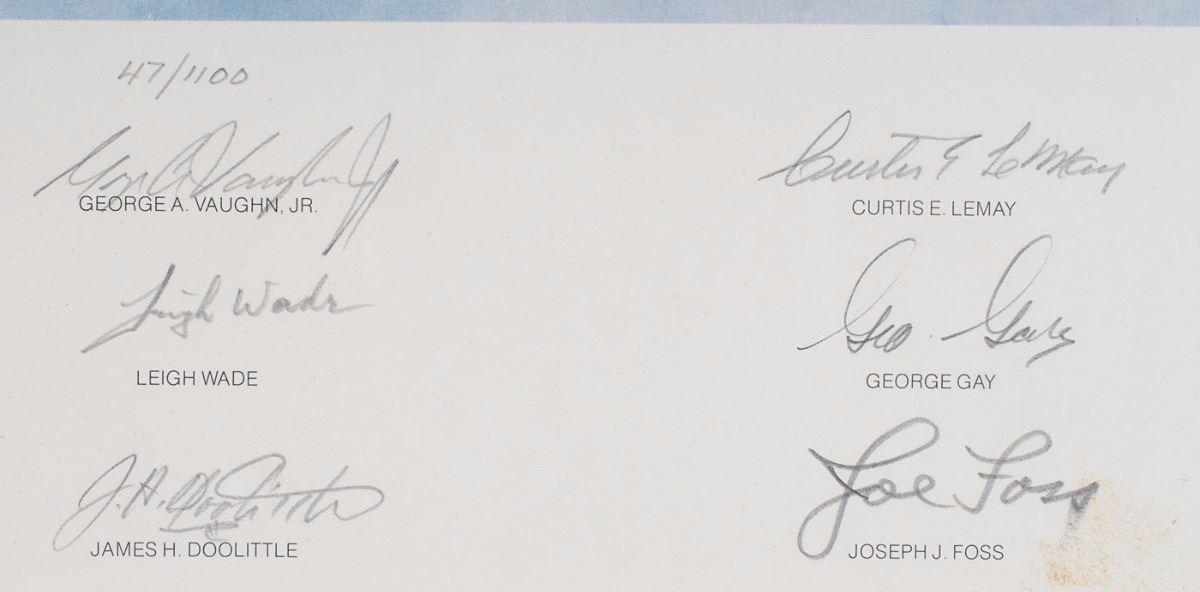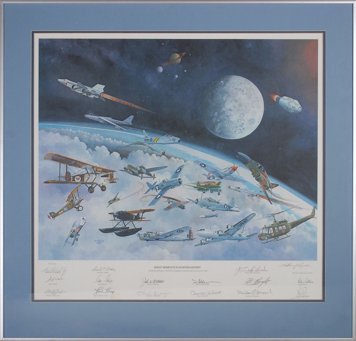 Exceptional color limited edition 24.5 x 22.75 print entitled ‘Great Moments in Aviation History,’ numbered 47/1100, signed in pencil by 15 important figures in the history of American flight: Neil Armstrong, George A. Vaughn, Jr., Leigh Wade, James H. Doolittle, Curtis E. LeMay, George Gay, Joe Foss, John W. Mitchell, Charles E. Yeager, Gail S. Halverson, Paul W. Tibbets, Frances S. Gabreski, Pete Knight, Michael J. Novosel, and Robin Olds, and also signed by the artist, William J. Reynolds. Double-matted and framed to an overall size of 30.25 x 29.25. In fine condition, with a small area of soiling (touching the tip of the Foss signature). Consignor notes that this print came from the estate of signer and World War II Ace Joe Foss. A scarce and sought-after piece signed by some of the most important space and aviation pioneers in history. Oversized.
