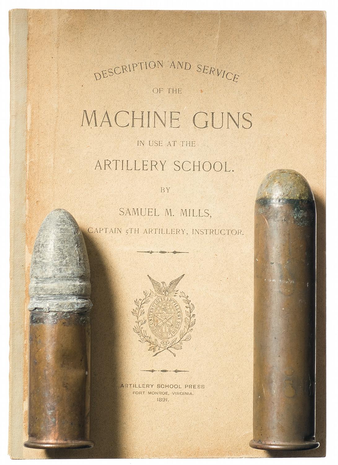 1) Original 1" diameter, 4" long gatling gun rim fire round. 2) Original 1" diameter, 4 1/2" long multi-ball load for gatling gun. 3) Manual from 1891 titled "Description and Service of the Machine Guns in use at the Artillery School" by Samuel M. Mills, Captain 5th Artillery, Instructor.