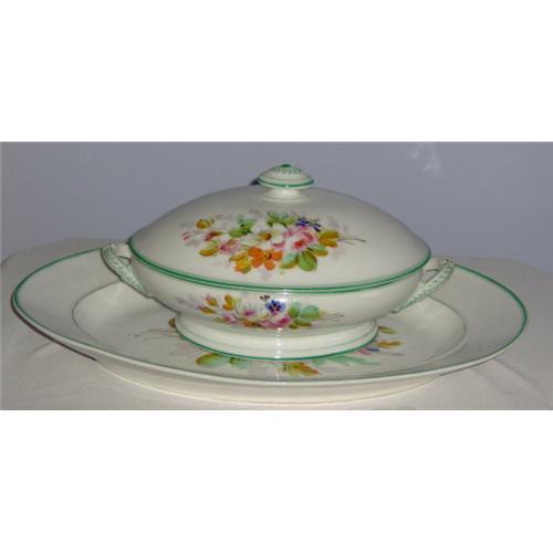 This stunning ironstone covered tureen and matching platter are in the style of the Gaudy design. They show a lovely handpainted multi-color and multi-floral design. As described by one expert, it is a "trailing floral design", meaning that the emphasis is on the flow of the flower design as interpreted by the original artist. This set is in near mint condition!<p>