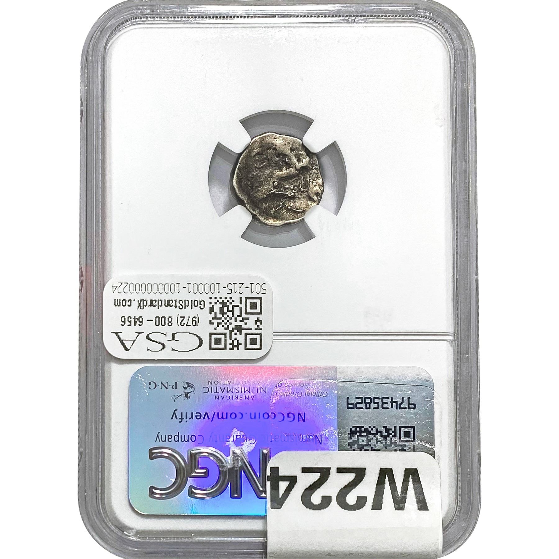 e. Coins sold referencing a third-party grading service are sold “AS IS” without any express or implied warranty, except for a guarantee by GSA that they are genuine. Removal or alteration of the holder, voids all of Bidder’s claims concerning that Product. Certain warranties may be available from the grading services and Bidders are referred to them for further details: Numismatic Guaranty Corporation (NGC), PO Box 4776, Sarasota, FL 34230, www.ngccoin.com/services/writtenguarantee.asp; Professional Coin Grading Services (PCGS), PO Box 9458, Newport Beach, CA 92658, www.pcgs.com/guarantee.html; ANACS, 6555 S. Kenton St., Ste. 303, Englewood, CO 80111; and Independent Coin Grading Co. (ICG), 7901 East Bellview, Ave., Suite 50, Englewood, CO 80111.