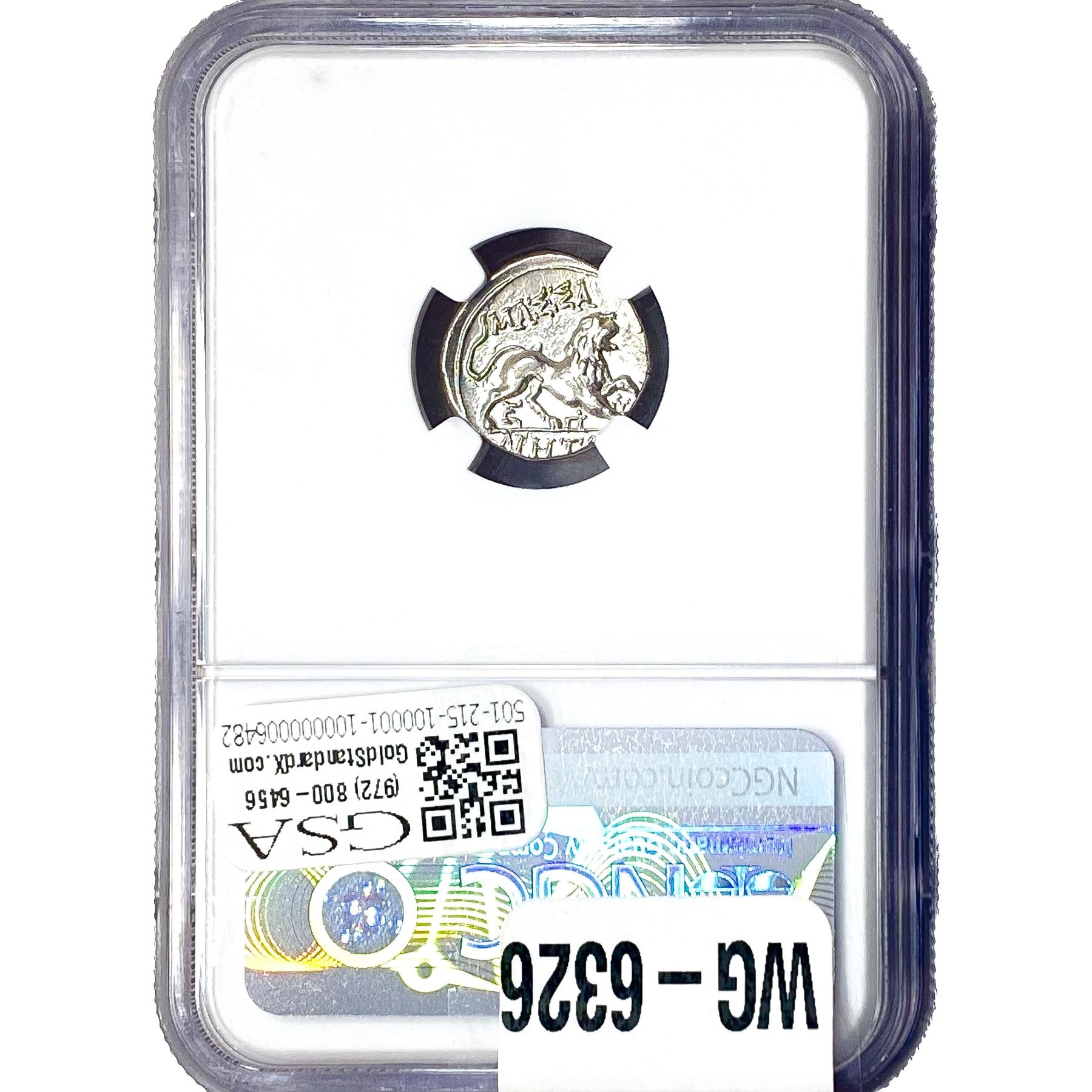 e. Coins sold referencing a third-party grading service are sold “AS IS” without any express or implied warranty, except for a guarantee by GSA that they are genuine. Removal or alteration of the holder, voids all of Bidder’s claims concerning that Product. Certain warranties may be available from the grading services and Bidders are referred to them for further details: Numismatic Guaranty Corporation (NGC), PO Box 4776, Sarasota, FL 34230, www.ngccoin.com/services/writtenguarantee.asp; Professional Coin Grading Services (PCGS), PO Box 9458, Newport Beach, CA 92658, www.pcgs.com/guarantee.html; ANACS, 6555 S. Kenton St., Ste. 303, Englewood, CO 80111; and Independent Coin Grading Co. (ICG), 7901 East Bellview, Ave., Suite 50, Englewood, CO 80111.
