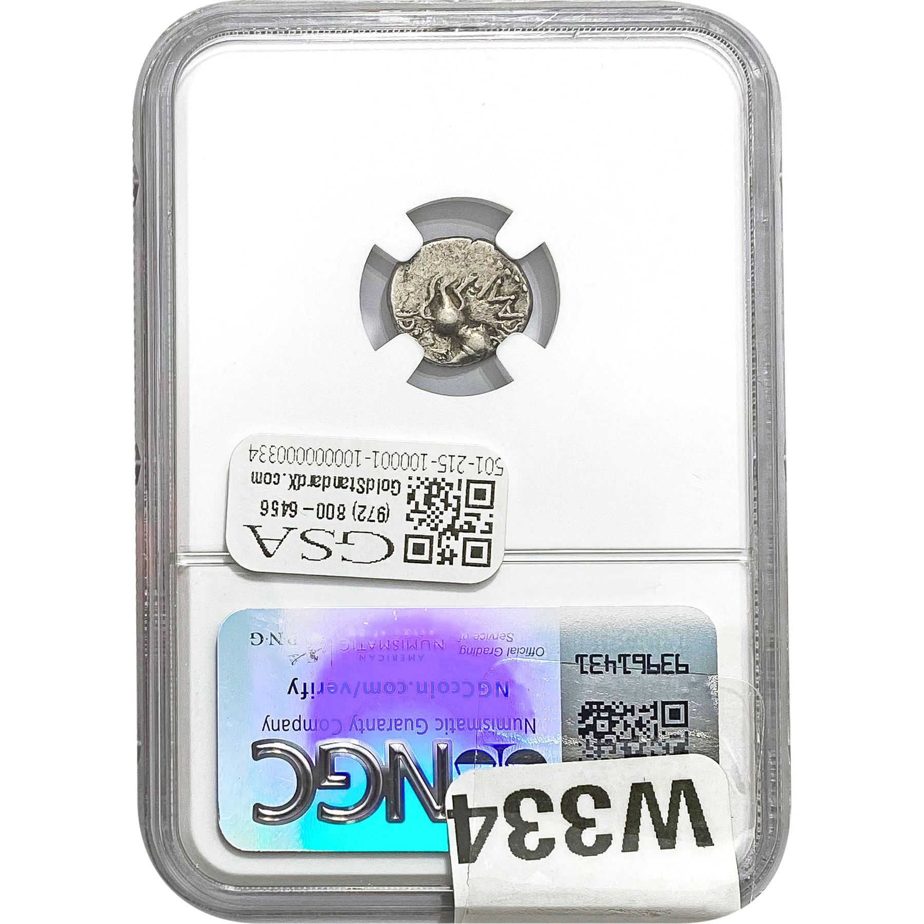COINS AND CURRENCY LISTED IN GSA’S CATALOG AS GRADED AND ENCAPSULATED BY PCGS, NGC, ANACS, ICG, PCGS CURRENCY, PMG, PCGS BANKNOTE GRADING, CMC OR ANY OTHER THIRD-PARTY GRADING SERVICE ARE LIKEWISE SOLD “AS-IS” EXCEPT AS EXPRESSLY SET FORTH HEREIN. ALL THIRD-PARTY GRADING SERVICE GUARANTEES, INCLUDING AUTHENTICITY, ARE THE SOLE RESPONSIBILITY OF THE THIRD-PARTY GRADING SERVICE AND NOT WARRANTIES OR GUARANTEES OF GSA. BIDDERS SHOULD CONTACT THESE THIRD-PARTY GRADING SERVICES DIRECTLY WITH RESPECT TO ANY CLAIMS OR QUESTIONS THEY MAY HAVE CONCERNING THEIR GUARANTEES AND WARRANTIES. BIDDERS ACKNOWLEDGE AND AGREE THAT AUCTIONEER IS NOT BOUND BY OR LIABLE FOR ANY OPINION OR CERTIFICATION BY ANY THIRD-PARTY GRADING SERVICE. REMOVAL OF A PRODUCT FROM ITS PROTECTIVE CASING OR HOLDER OR ALTERATION OF ANY COIN HOLDER WAIVES ALL RIGHTS CONCERNING THE PRODUCT CONTAINED THEREIN.