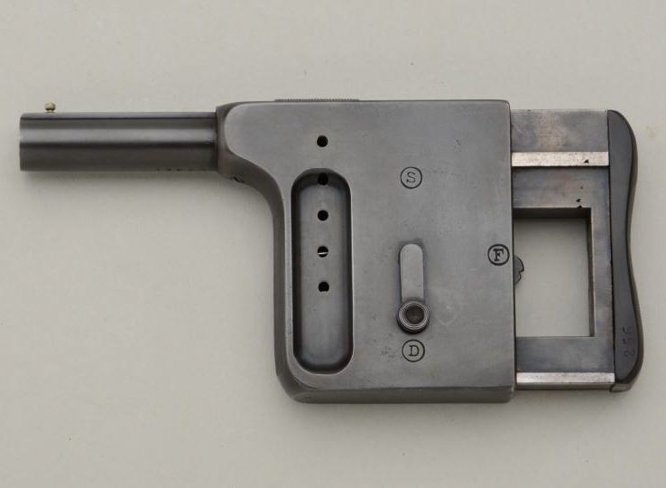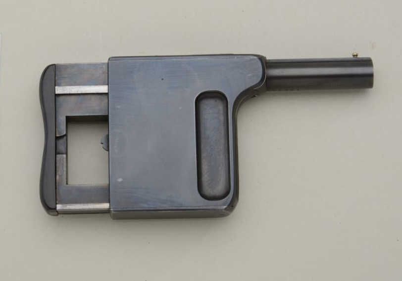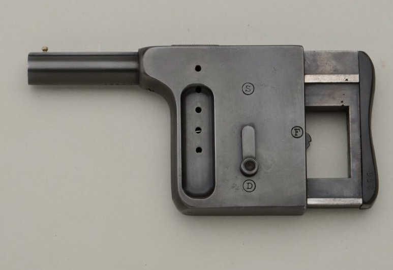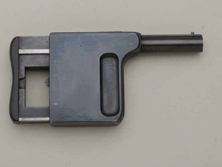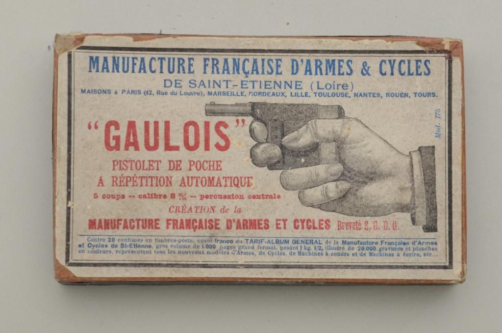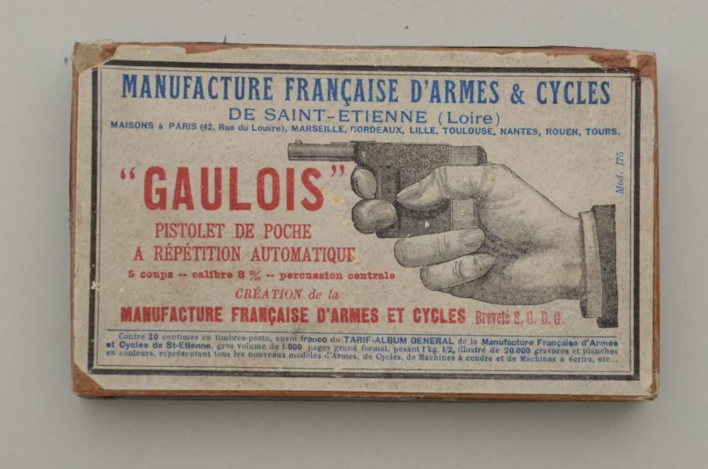 Gaulois palm squeezer in 8mm rim-fire extra short remaining in fine to excellent condition with its original cardboard box. The exterior the box shows a picture of the palm squeezer in the hand. Very few19th-century pistols are ever found in their original box and palm squeezers with cardboard are rare. From a lifetime collection of palm squeezer pistols of which most are included in this auction consignedby a prominent French collector of 50 years. Est.: $3,000 -$6,000.