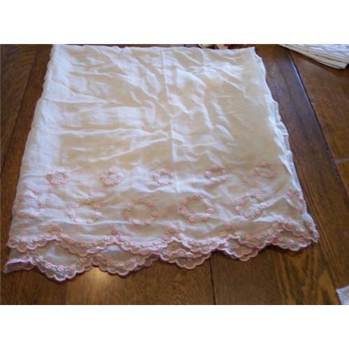 This is just beautiful material.I believe it is part of a curtain panel but not sure.Beautiful little pink roses with green leaves.Measures 68" across by 36 1/2" long.Has a couple of light stains(see photo) but I did not want to try washing it.Could easily be made back into a shorter curtain or valances.