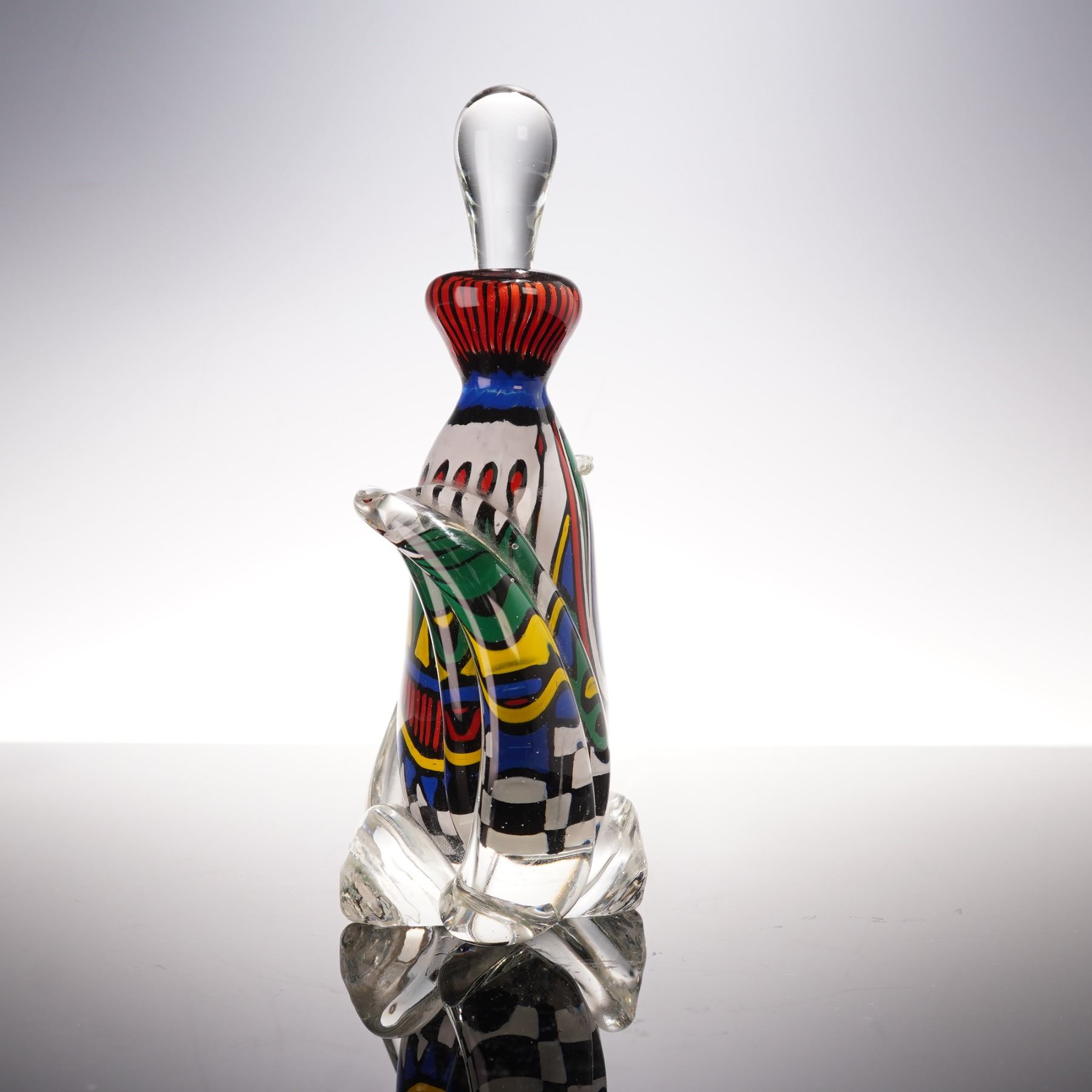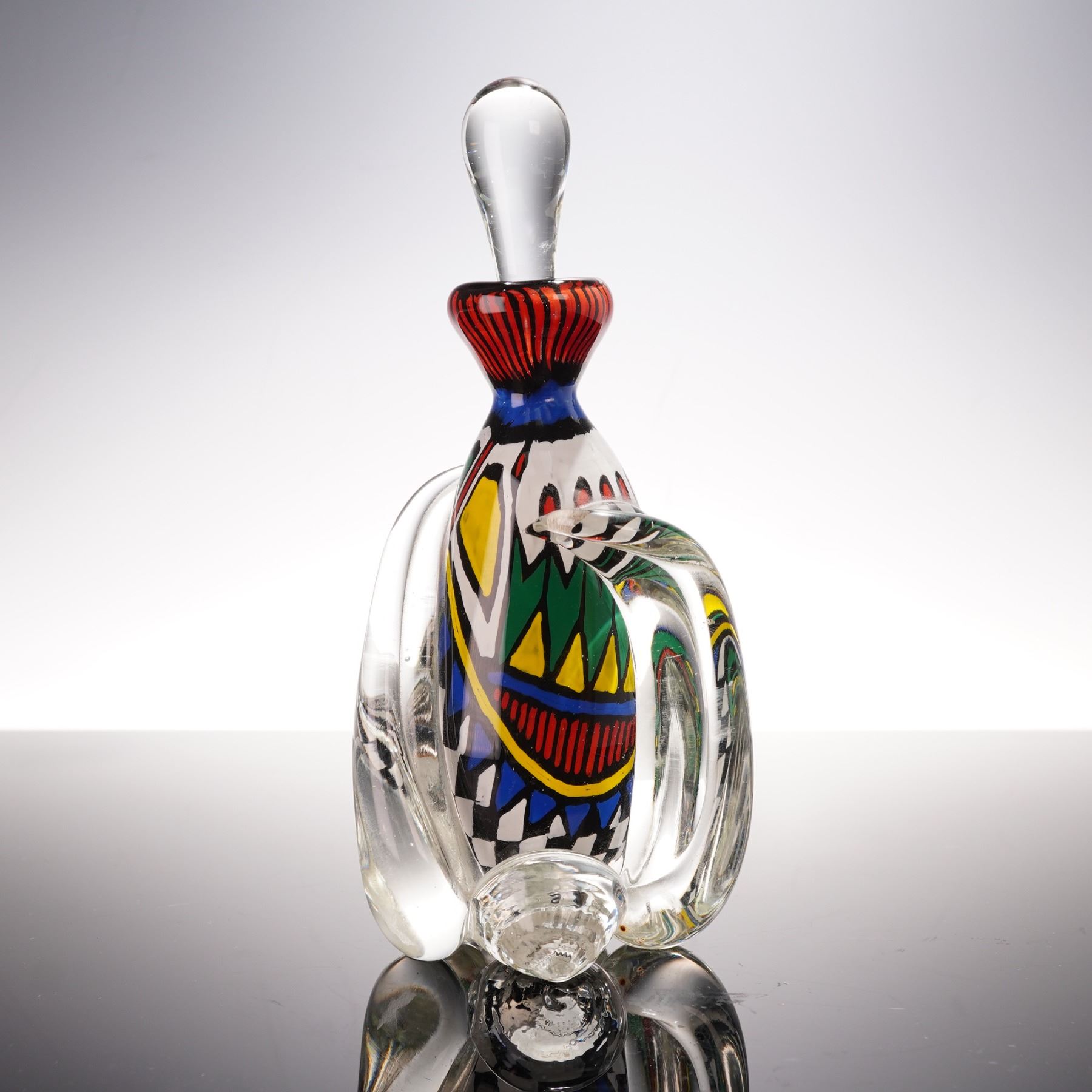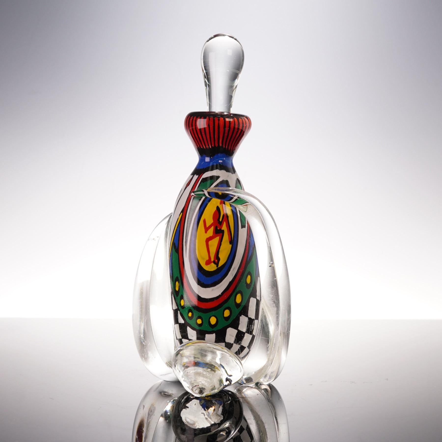 This vibrant art glass perfume bottle by Gavin Heath features a striking fusion of bold colors and geometric forms encased within a clear sculptural body. Layers of red, yellow, green, blue, black, and white create rhythmic patterns that resemble tribal and abstract motifs. The curving clear glass sides and rounded stopper add a sense of balance and movement, making it a captivating piece that highlights Heaths signature contemporary style. Gavin Heath etched signature.