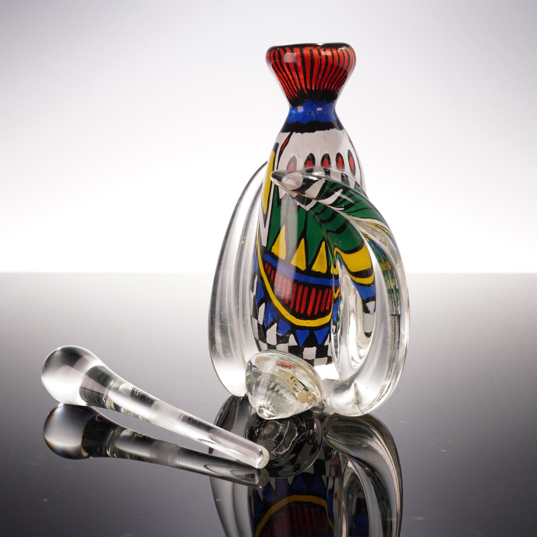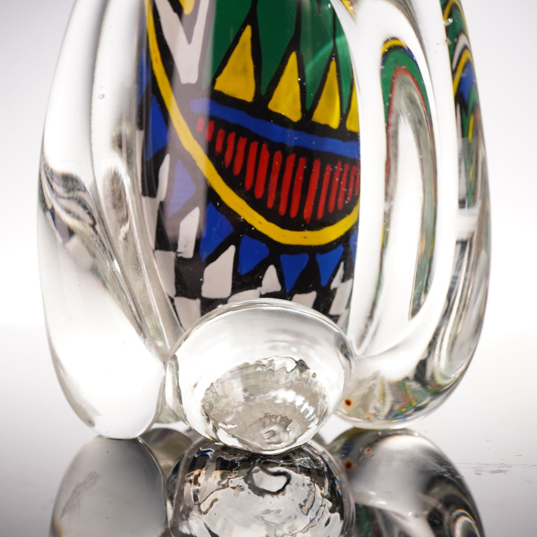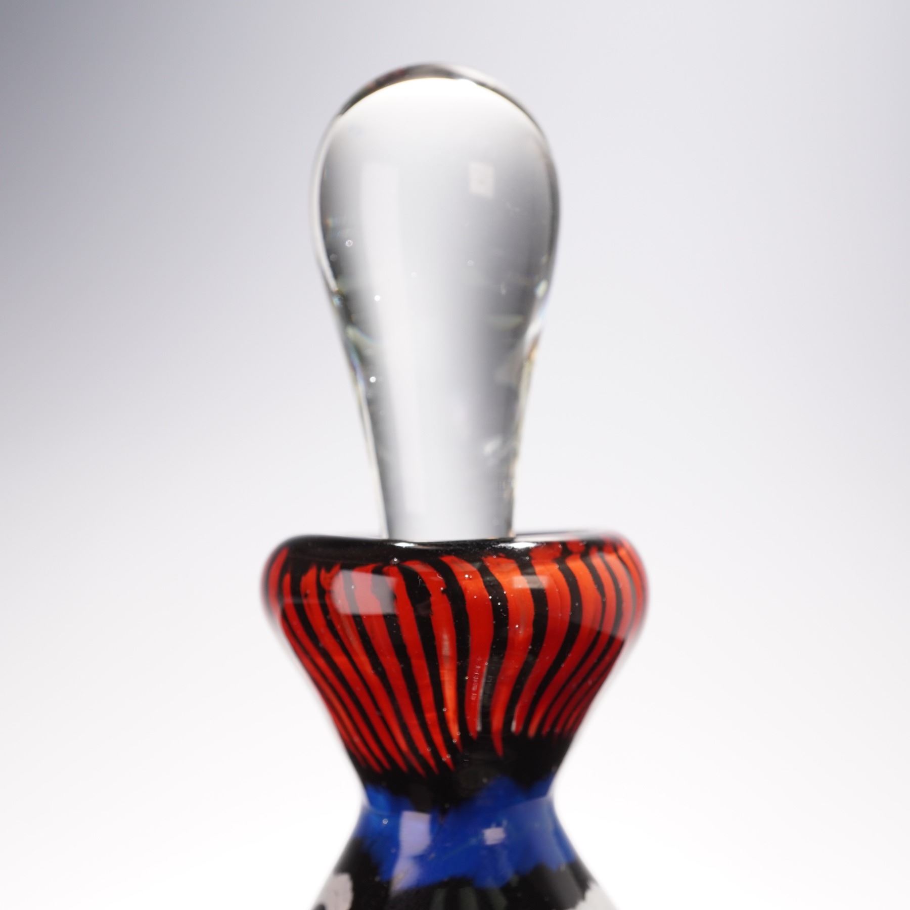 This vibrant art glass perfume bottle by Gavin Heath features a striking fusion of bold colors and geometric forms encased within a clear sculptural body. Layers of red, yellow, green, blue, black, and white create rhythmic patterns that resemble tribal and abstract motifs. The curving clear glass sides and rounded stopper add a sense of balance and movement, making it a captivating piece that highlights Heaths signature contemporary style. Gavin Heath etched signature.