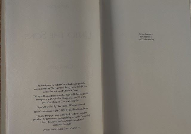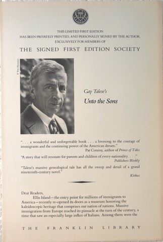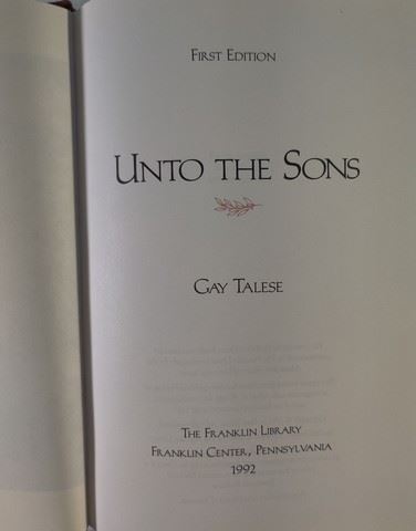 Unto the Sons (The Franklin Library, 1992) first edition leatherbound copy, printed exclusively for the Signed First Edition Society and signed by author Gay Talese. 635 Pages.
