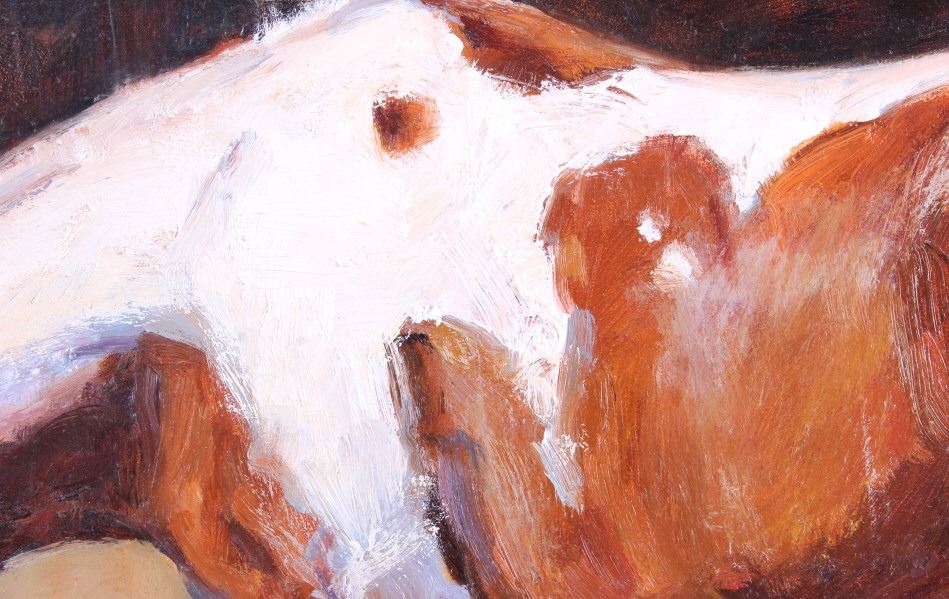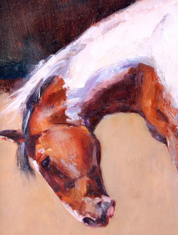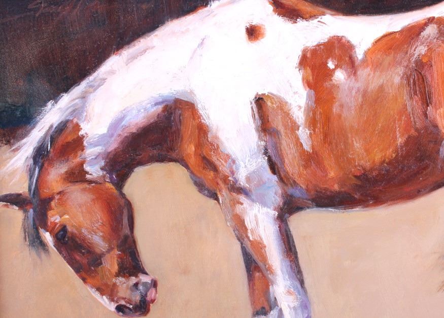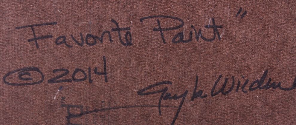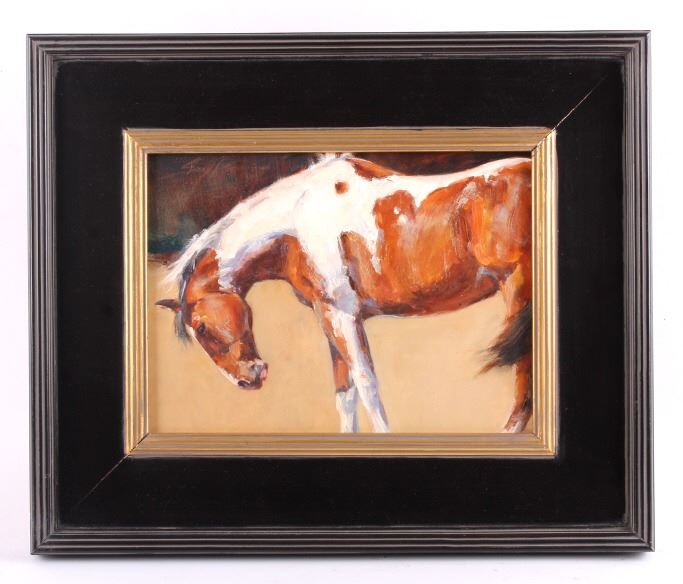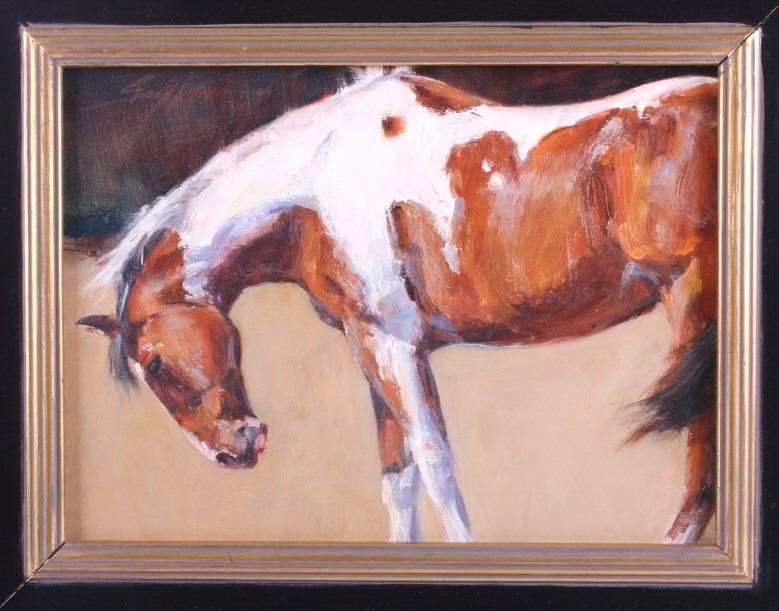 This is an original Gayla Wiedenheft oil on canvas painting. Wiedenheft is a self taught Montana artist whose works are focused on landscapes and animals. She is well known for her horse paintings. This painting is titled "Favorite Paint" and shows a beautiful brown and white paint. The painting is in good condition. The frame measures 15.5" x 18.5".