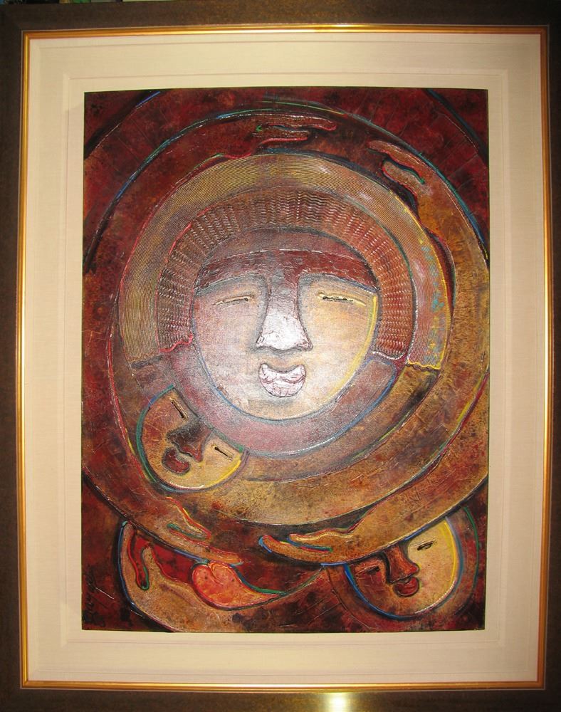 Gaylord Soli | Title Of Art: In Mother's Arms | Medium: Hand Signed By The Artist Original Painting On Canvas | Edition Size: Original | Unframed Size: 48x36 Inches | Offered Unframed or 48x36 Inches Stretched Ready to Hang for additional cost | Value: $ 5000 | Gaylord Soli Was Born In 1939 On A Farm In North Dakota, Shortly After His Parents Emigrated From Oslo, Norway. At The Age Of Three Gaylord And His Family Relocated To Los Angeles, California. While He Has Made Southern California His Home Ever Since, And Currently Works Daily In His Studio In Orange County, His Love Of Open Spaces Never Has Left Him. Much Of Gaylord's Earlier Years Were Spent On Adventures Around The Globe. These Quests Encompassed Camera Safaris To The Kalahari Desert Of Africa, Anthropological Research On The Native Tribes Of The Amazon River, Studies Of Mayan Ruins Of Chitchen Itza In The Yukatan Peninsula, And The Ancient World Of Alexander The Great, From Syria To Mongolia. All Of These Places And Experiences Have Had A Causal Effect Leading To The Exotic Nuances, Romantic Spirit, And Sometimes A Primeval Quintessence Found In Gaylord's Paintings. Gaylord Himself Is Quoted As Recognizing The Profound Influence These Early Experiences Have On His Art: I Have Been Fortunate To Have Traveled The World Extensively. This Has Allowed Me To Explore And Experience Primitive Cultures. I Think My Art Reflects These Experiences. With His Extraordinary Talent, Gaylord Produces Work Of Enormous Impact And Unusual Sensuousness; That Is Filled With Primal Mystery. Gaylord Is A Self-Taught Artist, With Diverse Life Experiences. He Started His Own Company Designing Sports Attire, Has Pinstriped Antique Cars And Designed Fashions For Blackwell And Other Top Designers. Ultimately, He Evolved To Work In The Field Of Serigraphy, Founding Clearwater Publishing In The Early Eighties. In That Capacity, He Gained A Reputation For Producing High Quality Prints For Many Known Fine Artists Including Richard Diebenkorn, Mel Ramos, And Peter Max. Gaylord's Artwork Is Imbued With A Feeling Of Freedom And Spontaneity In Both Image And Technique. Thematically, An Idea Is Allowed A Metamorphosis, To Expand And Grow As The Work Is Executed. Lines, Figures, Textures And Colors Evolve As The Work Progresses Until The Final Stroke Makes The Statement Of Completion.