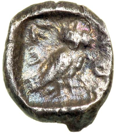 Gaza. Athenian Imitative Coinage, c. 400-332 B.C.E., AR Hemi Obol (0.2g). Helmeted head right of Athena. Reverse: Owl standing right with traces of AThE to right; lily and "O" in left field. "O" is Ayin, abbreviation of Aza (Gaza). Meshorer & Qedar, Samarian Coinage p. 66. Obverse is Good, reverse is Nice Fine, nicely centered.
