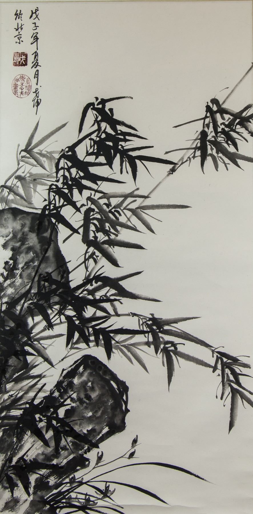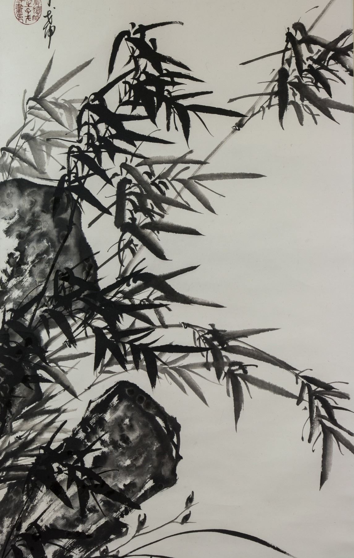Ink on paper, hanging scroll. Featuring bamboo and craggy rock. Signed Ge Kun, inscribed with 2 artist seals. 98 x 50 cm