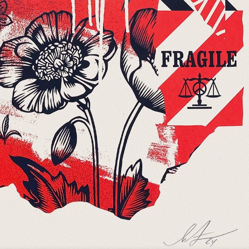 "Gears of Justice" is a limited edition screen print on thick cream Speckletone paper by Shepard Fairey, numbered 490/550 and hand signed by the artist. Includes Letter of Authenticity. Measures approx. 24" x 18" (image).