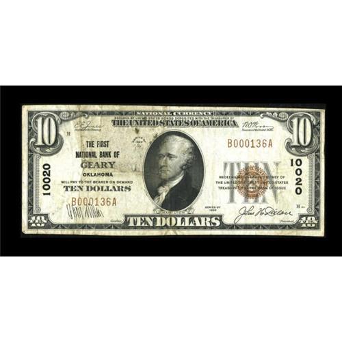 <B>Geary, OK</B></I> - $10 1929 Ty. 1 <B>The First NB</B></I> Ch. # 10020<BR> This is just the fifth small size to turn up on this tiny western Oklahoma bank. While this institution made it through the note issuing period, it chose to only issue the Type 1 variety. <B>Very Fine</B></I> from the point of wear, with a bit of light staining on the face.<BR><BR><b>Shipping:</b> Coins & Currency (<a target="_blank" href="http://www.heritageauctions.com/common/shipping.php">view shipping information</a>)