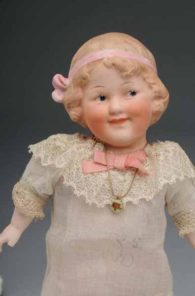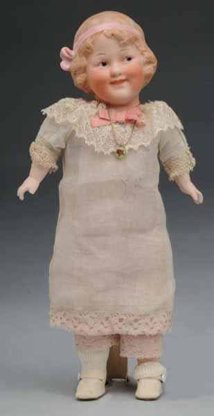 Description Germany, Ca. 1910. Bisque shoulder head incised "7850" and Heubach Square Mark. Sweet coquette with molded hair and pink hairbow, intaglio eyes, dimples and smiling mouth. All factory original with cloth body, bisque hands (thumb broken), composition lower legs, cotton shift with lace trim and undies, new shoes and socks. Condition (Excellent). Size 10 - 1/2" T.
