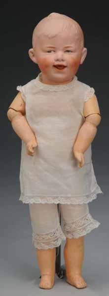 Description Germany, 1910. Marked "7911" with Heubach Square Mark. Bisque head with sharply molded and painted hair with lots of detail, squinty intaglio eyes, open/closed mouth with molded tongue (chip on neck socket). Very good jointed composition and wood body. Wearing vintage white cotton shift and pantaloons. Condition (Excellent). Size 16" T.