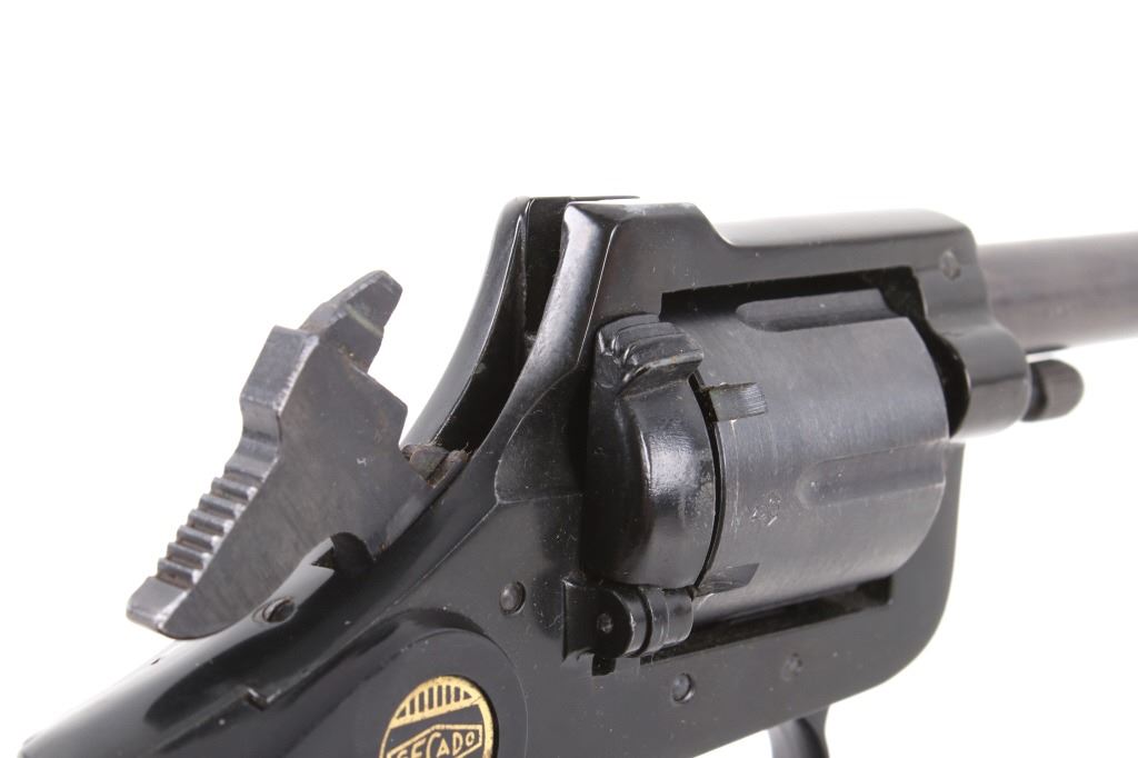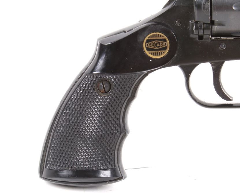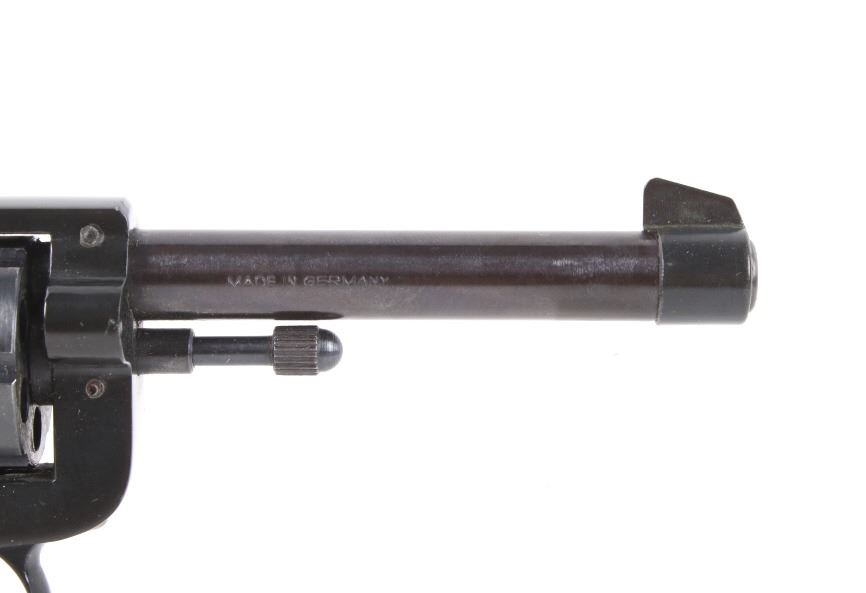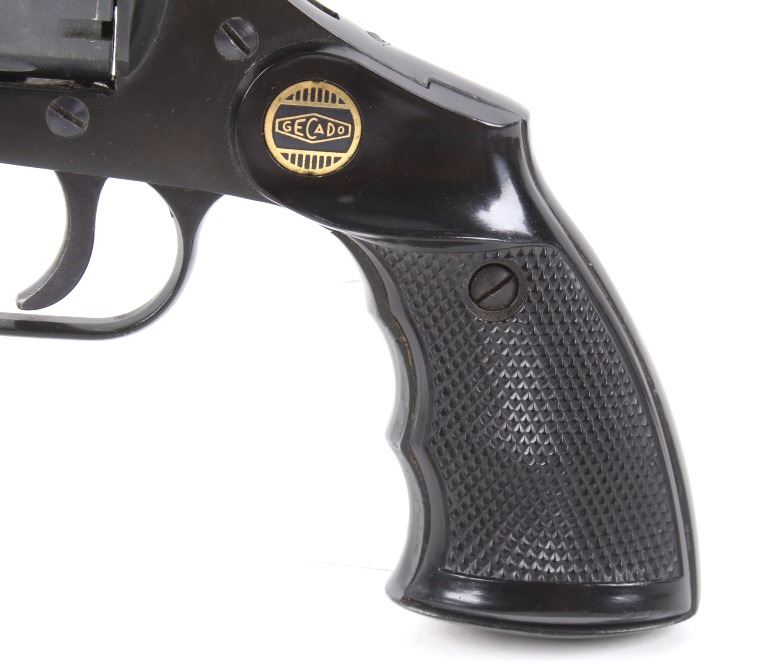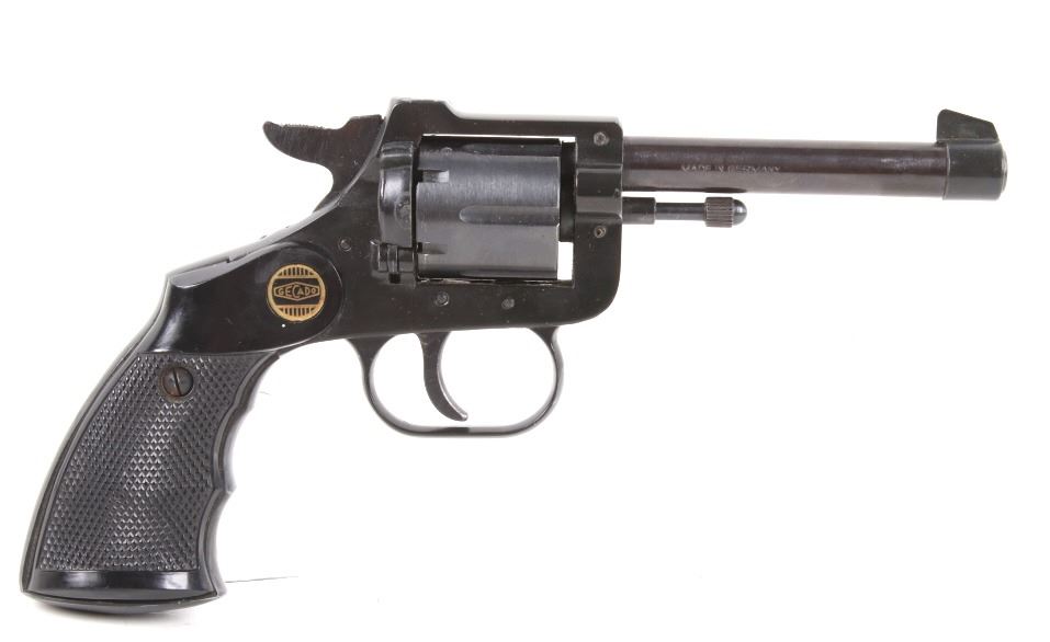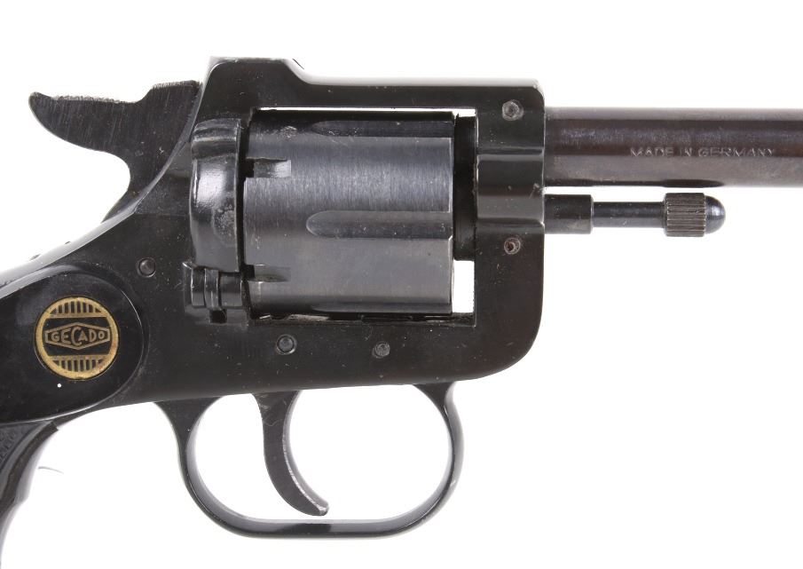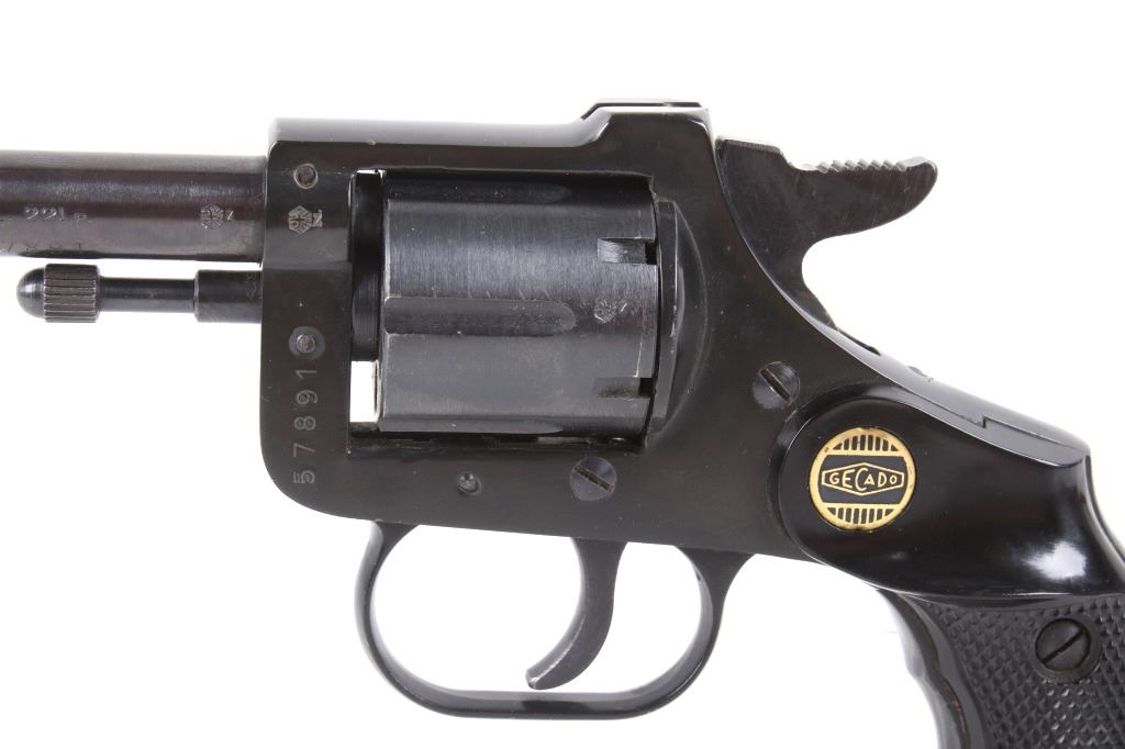 Included in this lot is a Gecado double action .22 Long Rifle caliber revolver. This revolver utilizes a 3 5/8” barrel chambered in .22 LR caliber. The left of the barrel is roll stamped “Cal. .22 Lr.” and the serial number. The frame is additionally stamped with the serial number and a cartouche in front of the cylinder. The right of the barrel is also stamped “Made in Germany”. The cylinder features a swing latch to load and unload the revolver. The black plastic grips are in good condition. The double action on this firearm operates as intended. Serial Number: 57891. This is a modern firearm and requires a FFL transfer or NICS background check.