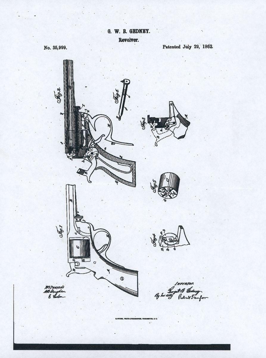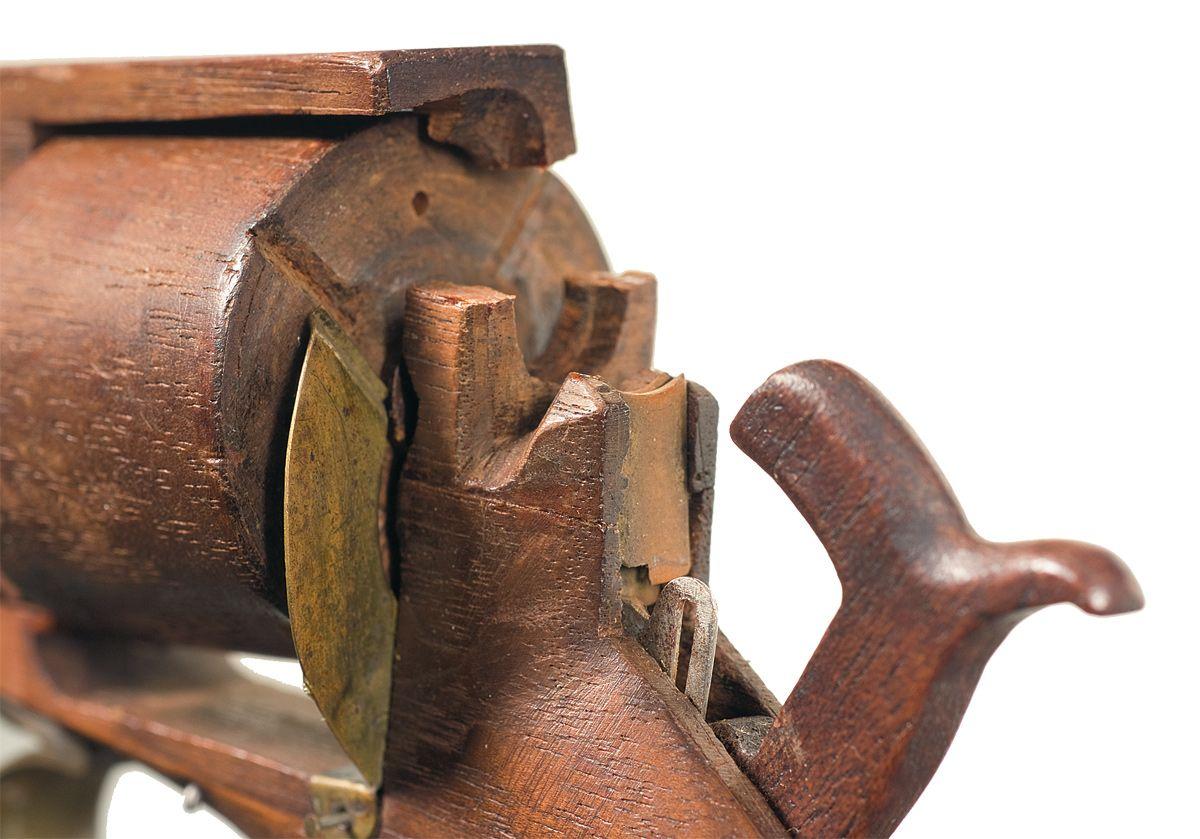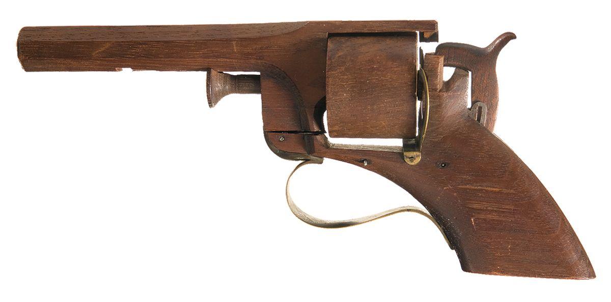 1862 revolver patent model, comprised mostly of mahogany with small brass components. The trigger is missing but none of the patent features are connected with it. Complete with copies of documents from the United States Patent Office. In very good condition, with minor dents and dings, some minor chipping and a few visible light cracks.
