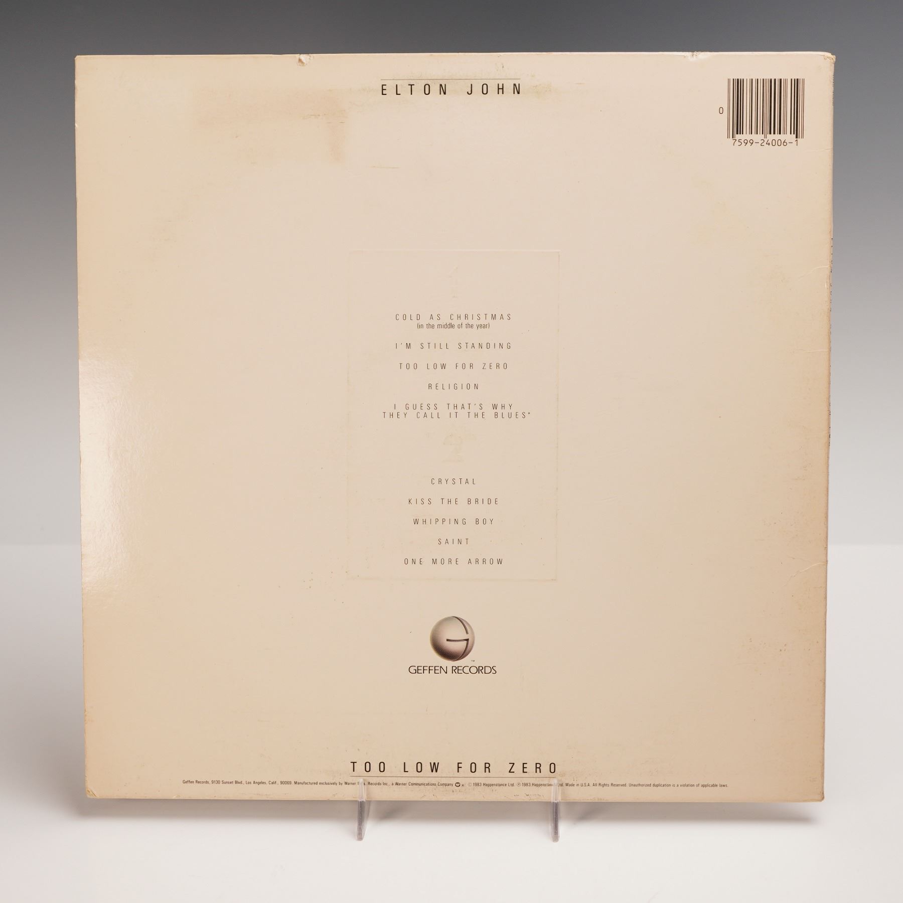 A 12-inch vinyl long-playing record of "Too Low for Zero" by Elton John, released in 1983 on Geffen Records. This pressing include notable hits such as "I'm Still Standing," "I Guess That's Why They Call It the Blues," and the title track "Too Low for Zero." Reuniting Elton John with lyricist Bernie Taupin and his classic backing band, the album reflects a revitalization of the artist's creative energy during the early 1980s. The minimalist album cover presents a stark white background with embossed numerical typography at the center and simple lettering for artist and title, while the reverse sleeve lists all tracks in a matching restrained layout, alongside the Geffen Records logo.