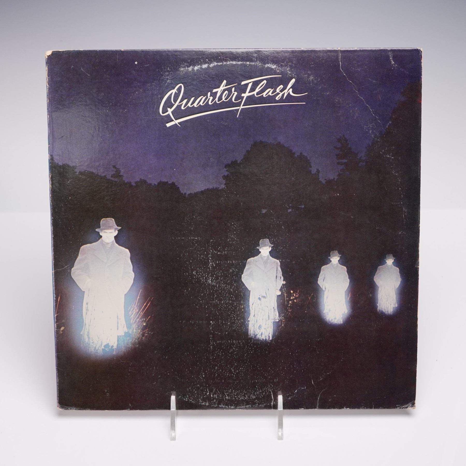 The eponymous debut album by Quarterflash, released on Geffen Records. This early 1980s pressing showcases the band's distinctive fusion of rock and new wave, prominently featuring the alto saxophone stylings and vocals of Rindy Ross. The track list includes the breakout hit "Harden My Heart," alongside compositions such as "Find Another Fool," "Critical Times," and "Williams Avenue." The artwork features spectral, luminescent figures cast against a shadowy woodland backdrop, complemented by a reverse sleeve of a cream toned ground and a split image of a band member.