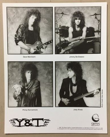 Folder from Geffen Records containing a single page with four headshots, and signed letter from the band Y&T. Each band member signed the letter - Dave Meniketti, Jimmy De Grasso, Philip Kennemore, and Joey Alves - where they announced they were back with a new record company (Geffen) and new drummer (Jimmy De Grasso).