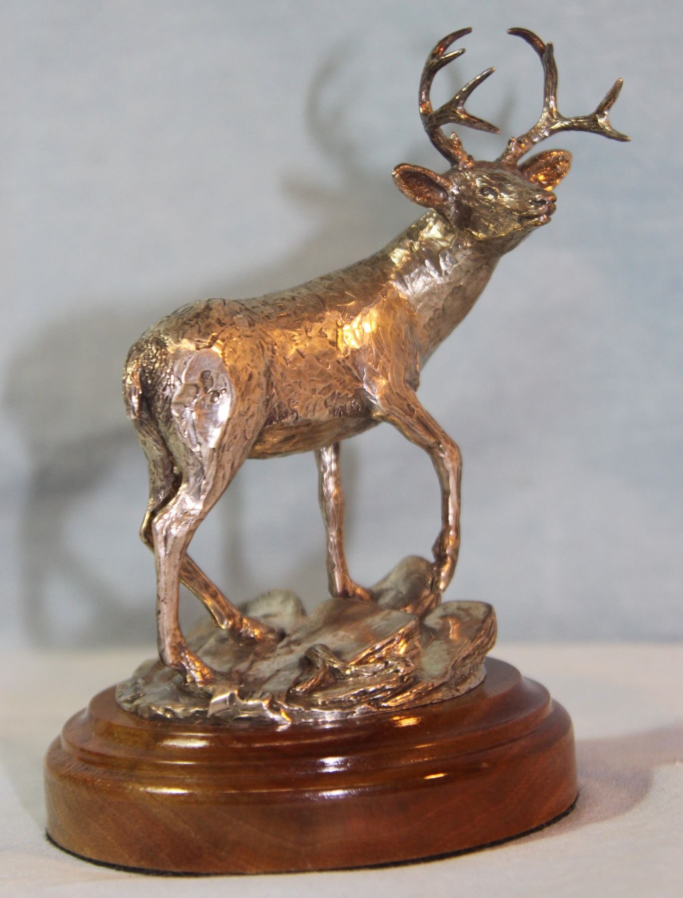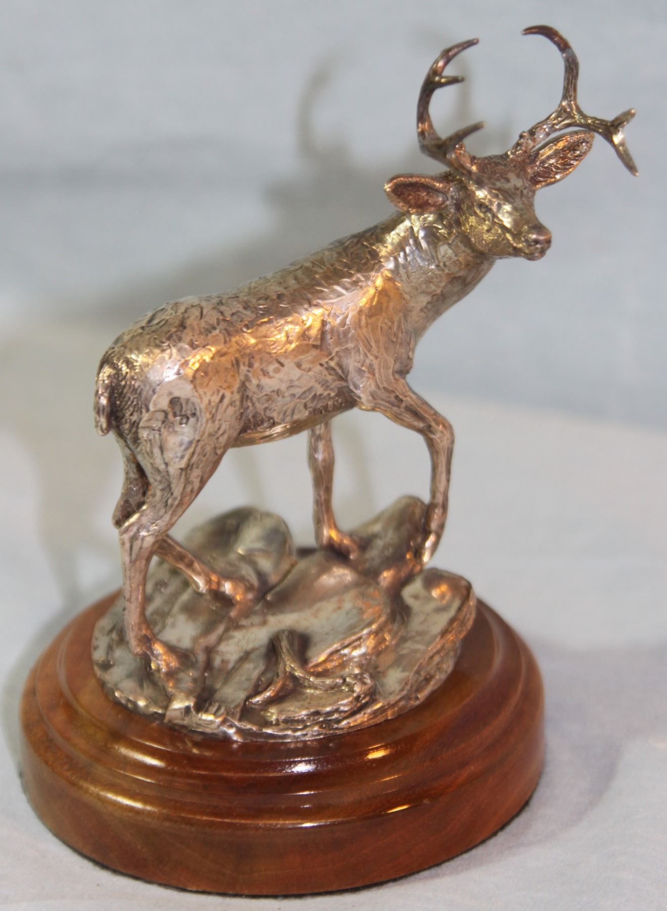 Geffree, Paul sterling silver sculpture, Whitetail buck, 1984, 1/5, 5" h x 4" x 3"