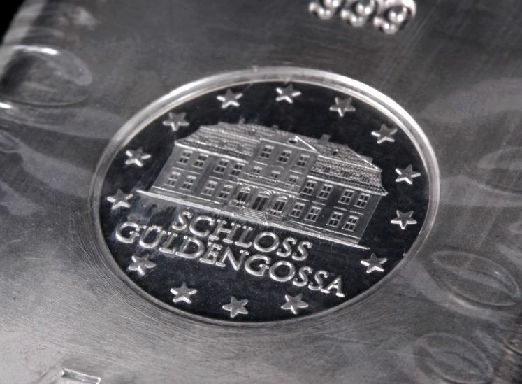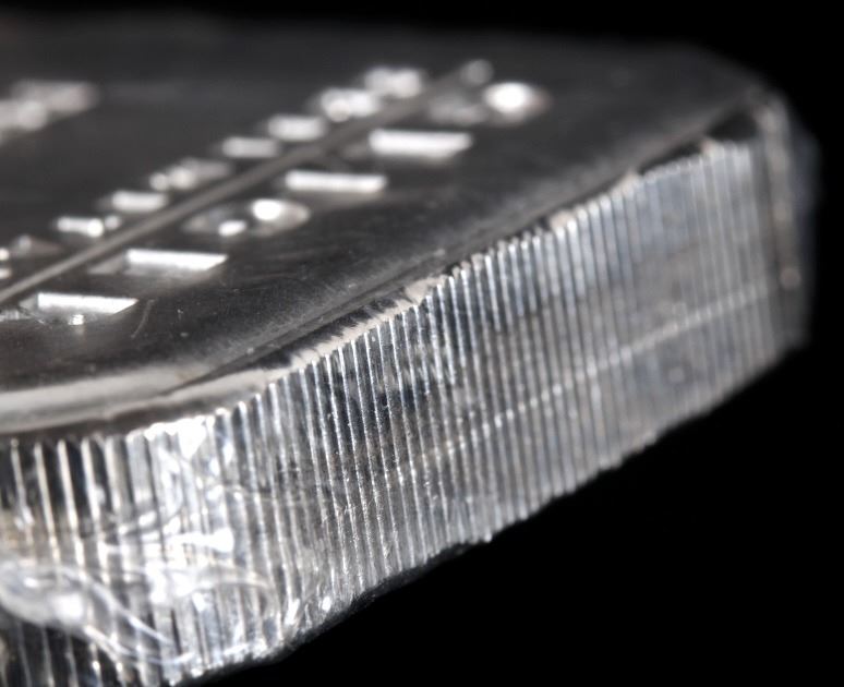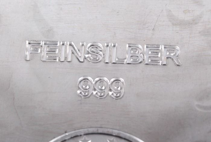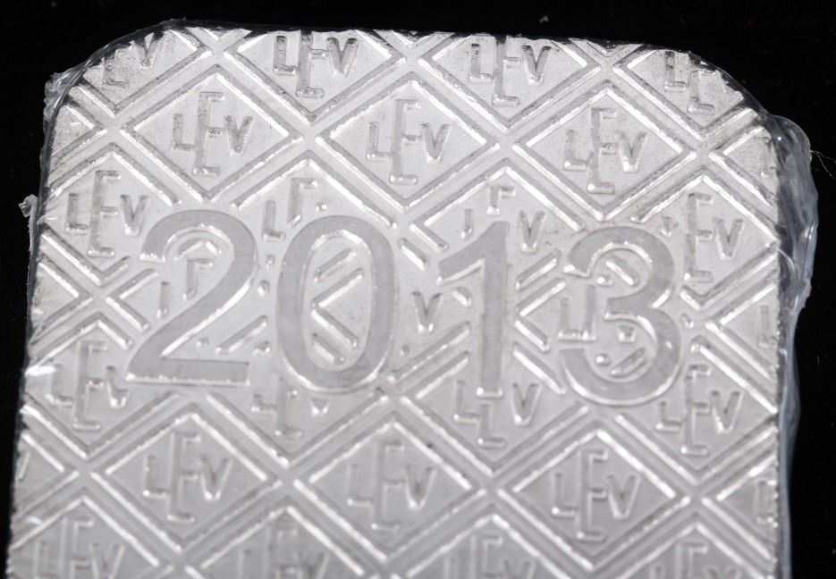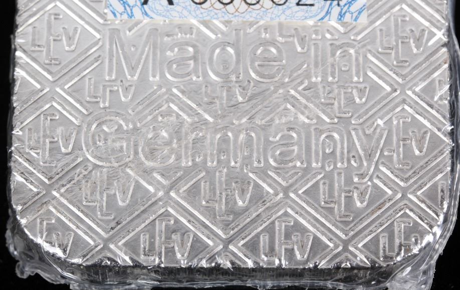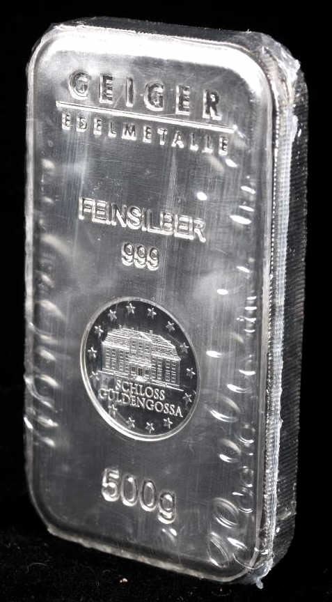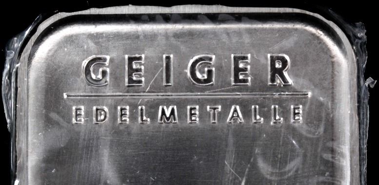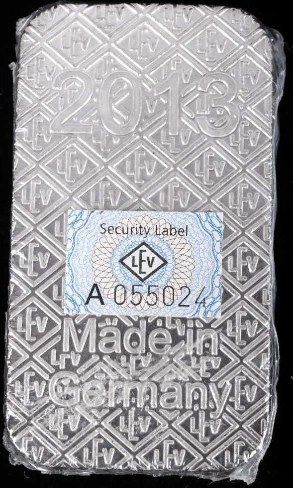 This lot features a Geiger security line 999 fine silver bar. This piece is new in its original wrapper and security label. In contrast to other bars, the edge is not smooth, but ribbed as a coin in order to prevent manipulations like filing off small pieces. The reverse side is textured, showing the LEV-rombus. All bars are marked. The entire production process is retraceable to the batch of raw material. The bar was minted in 2013. It measures 3 5/8" L x 2" W x 7/16" D