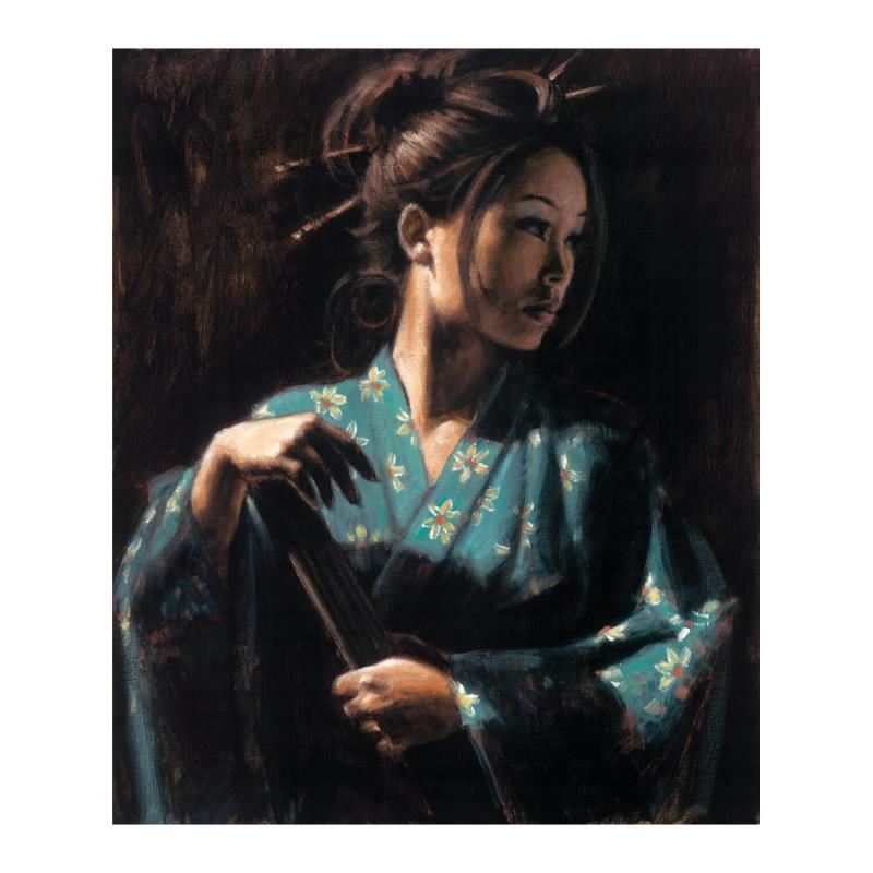 "Geisha En Turquesa" is a hand embellished limited edition giclee on stretched canvas by Fabian Perez. The piece is numbered and hand signed by the artist and comes with a Certificate of Authenticity. Measures approx. 40" x 32" (image). Please allow 5 additional business for items that include canvas stretch or framing.