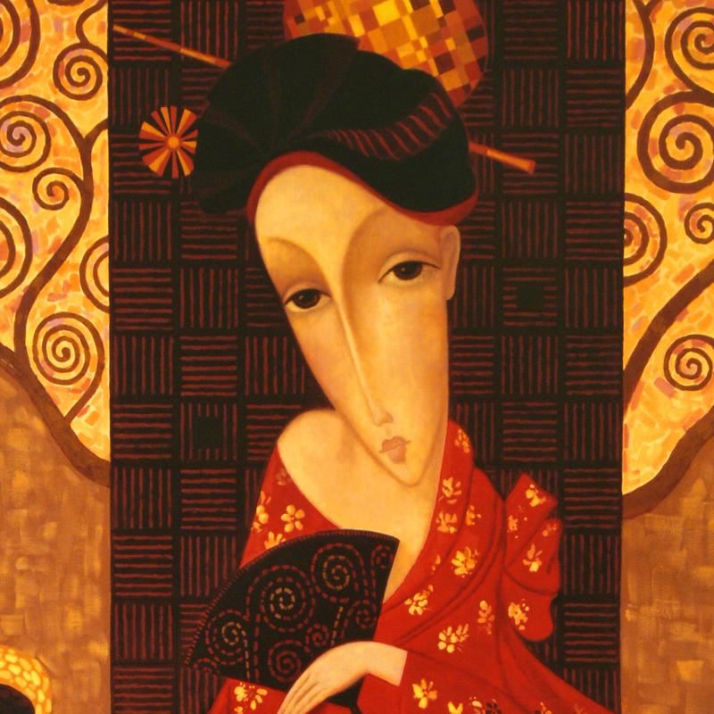 Combining time-honored religious icon painting with western style portraiture, the hauntingly beautiful art of Sergey Smirnov (1953-2006) is inspired by the 'Parsuna' art movement. "Geisha In Red" is a limited edition mixed media on canvas, printed in 2007, numbered in verso, plate signed and published after his death, and hand signed by the artist's widow, Natasha Smirnov. Includes Certificate of Authenticity! Measures approx. 32.5" x 50.5" (image).