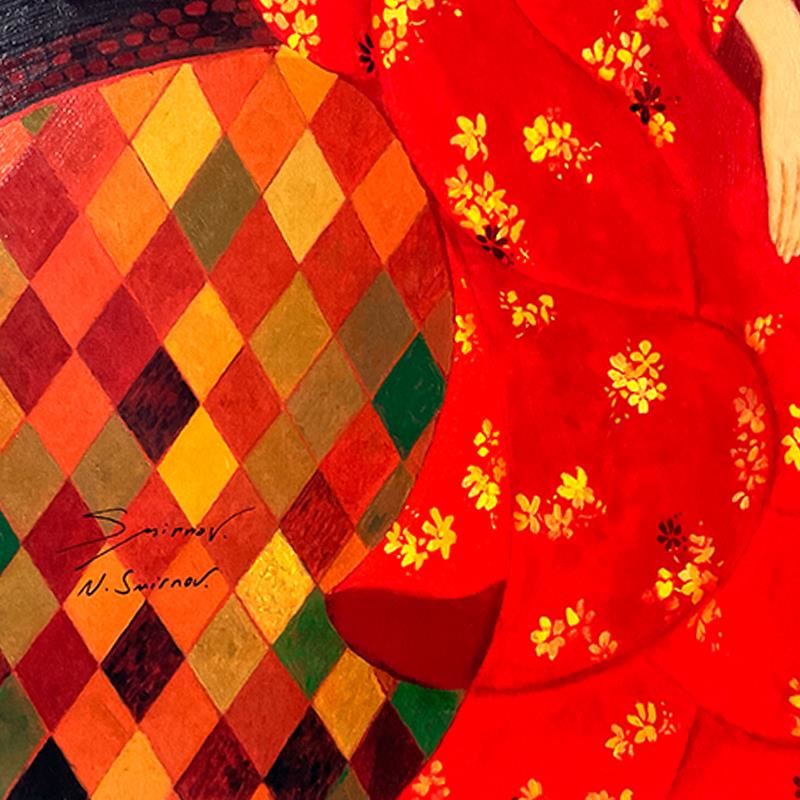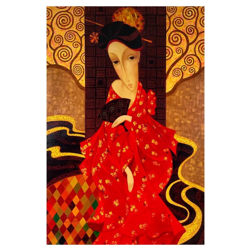 Geisha In Red by Smirnov (1953-2006). All available information is listed in the description and shown in the photo. "Geisha In Red" is a limited edition mixed media on canvas, printed in 2007. This piece is AP numbered 1/25 in verso, plate signed and published after his death, bearing the hand signature of the artist's widow, Natasha Smirnov. Includes Letter of Authenticity. Measures approx. 32.5" x 50.5" (image).