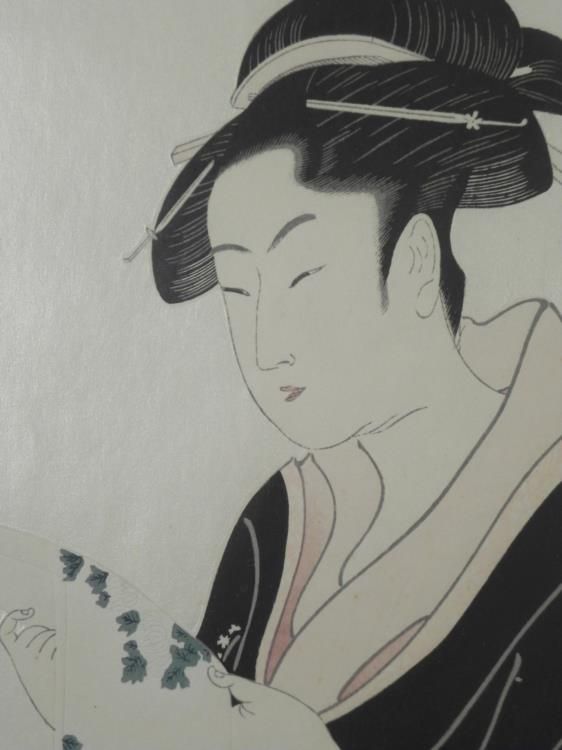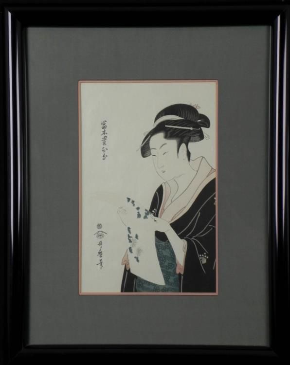 This is a portrait of a Geisha, done in the style of master woodblock artist Utamaro. The flowing lines create an elegant look, and graceful form. Medium: Woodblock on rice paper Circa 1940's- Image size: 7 1/4 x 11 1/4 inches Framing: Double matted in pink and green linen matte, in black laminate frame Frame size: 19 1/4 1/4 x 14 1/4 inches Condition: Excellent