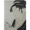 This is a portrait of a Geisha, done in the style of master woodblock artist Utamaro. The flowing lines create an elegant look, and graceful form. Medium: Woodblock on rice paper Circa 1940's- Image size: 7 1/4 x 11 1/4 inches Framing: Double matted in pink and green linen matte, in black laminate frame Frame size: 19 1/4 1/4 x 14 1/4 inches Condition: Excellent