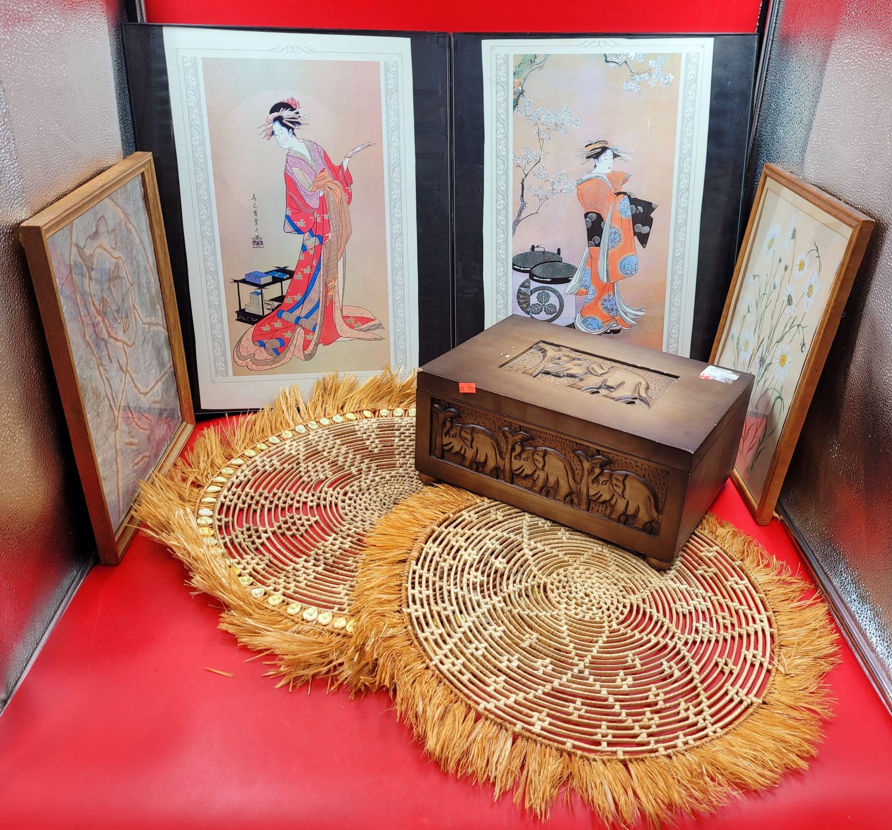 Geisha Prints, Elephant Storage Box, & Weaved Wicker Wall Art