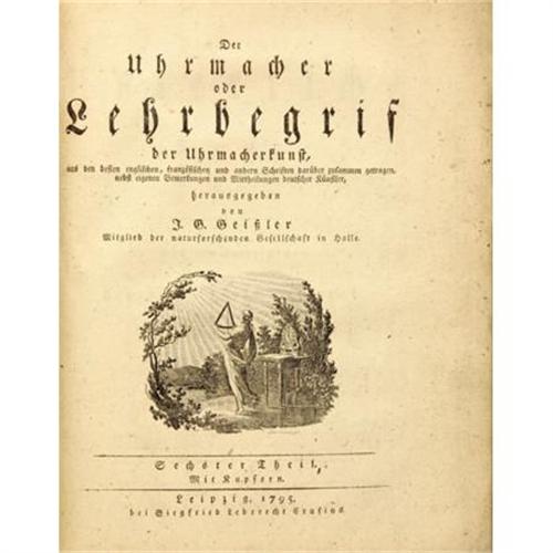 <B>J.G. Geissler. </B></I><B><I>Der Uhrmacher </B></I></B></I><I>oder Lehrbegrif der Uhrmacherkunst</B></I><B><I> </B></I></B></I><I>(</B></I><B><I>The Clockmaker </B></I></B></I><I>or Manual for the Art of Clockmaking) </B></I>in Two Volumes<I>.</B></I> Leipzig: Siegfried Crusius, 1795 and 1796 respectively. <BR>Four parts (of ten) in two Quarto volumes, with four title-pages. 246; 154 pages. Numerous copper-engraved plates and fold-out schematics for various clock parts. In German. <BR><BR>Chocolate buckram. Generally worn. Some separation at hinges with old tape repairs, a few loose leaves, chipped pages, small tears to fold-out schematics, etc. Textblock shows moderate age toning overall; some water staining to interior pages. <BR><BR>German horology reached its peak in the sixteenth and seventeenth centuries, this being an example of the type of training manual used at the time.<BR><BR><BR><b>Shipping:</b> Books & Catalogs (<a target="_blank" href="http://www.heritageauctions.com/common/shipping.php">view shipping information</a>)