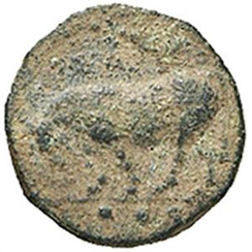 Sicilia. Gela. Trias, 420-405 a.C. D/ “. Toro stante a sinistra. In esergo: tre globetti. R/ Testa di giovane dio fluviale a destra. Cfr. SNG ANS 106. gr. 3.81 AE. Patina verde con sedimenti calcarei. BB.