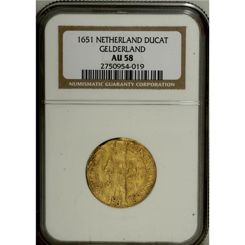 <B>Gelderland. Gold Ducat 1651,</B></I> F-237, KM5, AU58 NGC. Weakly struck with a wavy flan and ragged edge.<BR><BR><b>Shipping:</b> Coin/Currency (<a target="_blank" href="http://www.heritageauctions.com/common/shipping.php">view shipping information</a>)