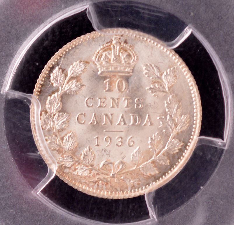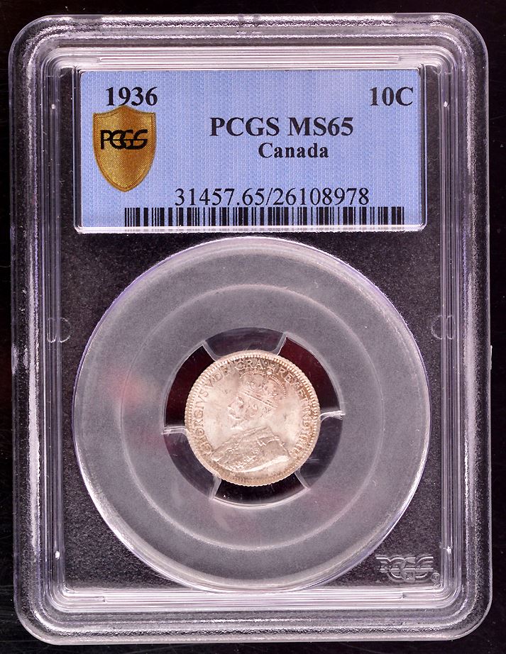 Ten Cents, 1936, graded by PCGS Mintstate-65. Nice lustre and light toning.