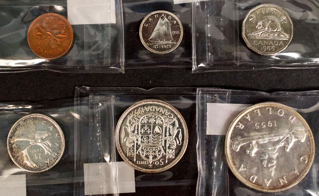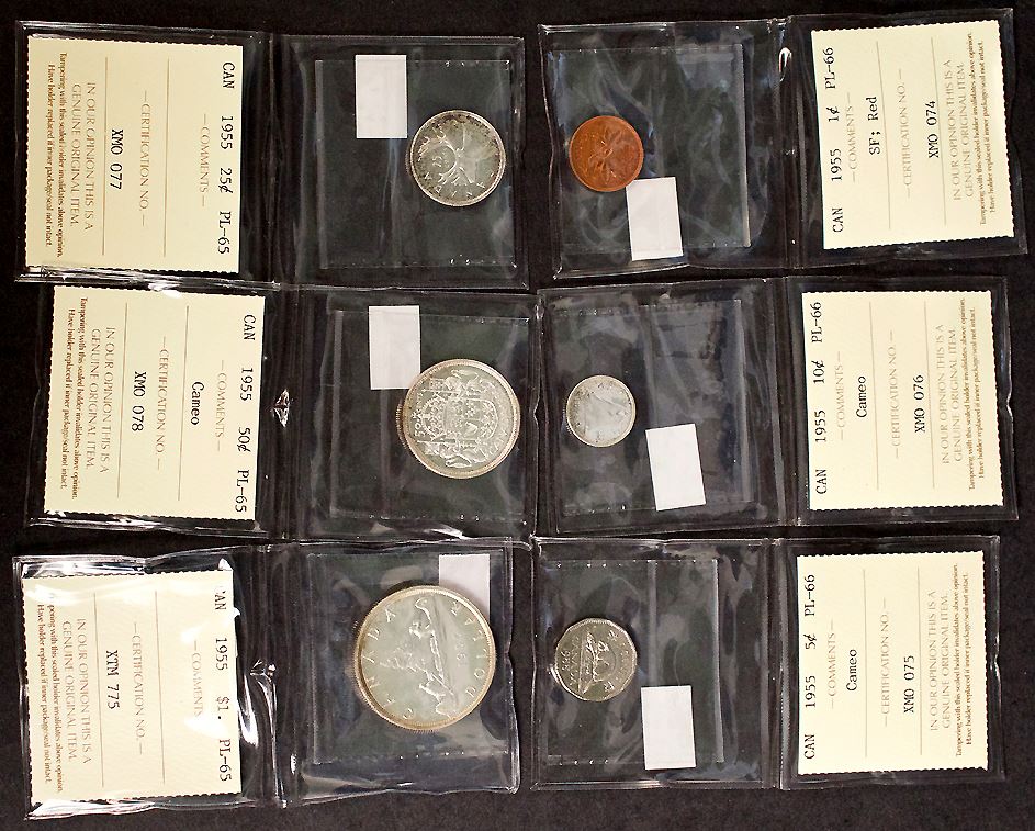 Prooflike Set, 1955, with all coins graded Gem PL, by ICCS: Cent, SF, PL-66, Red, Cameo; 5 Cents, PL-66, Cameo; 10 Cents, PL-66, Cameo; 25 Cents, PL-65; 50 Cents, PL-65; $1, PL-65; Silver is brilliant or is lightly toned. A nice set.