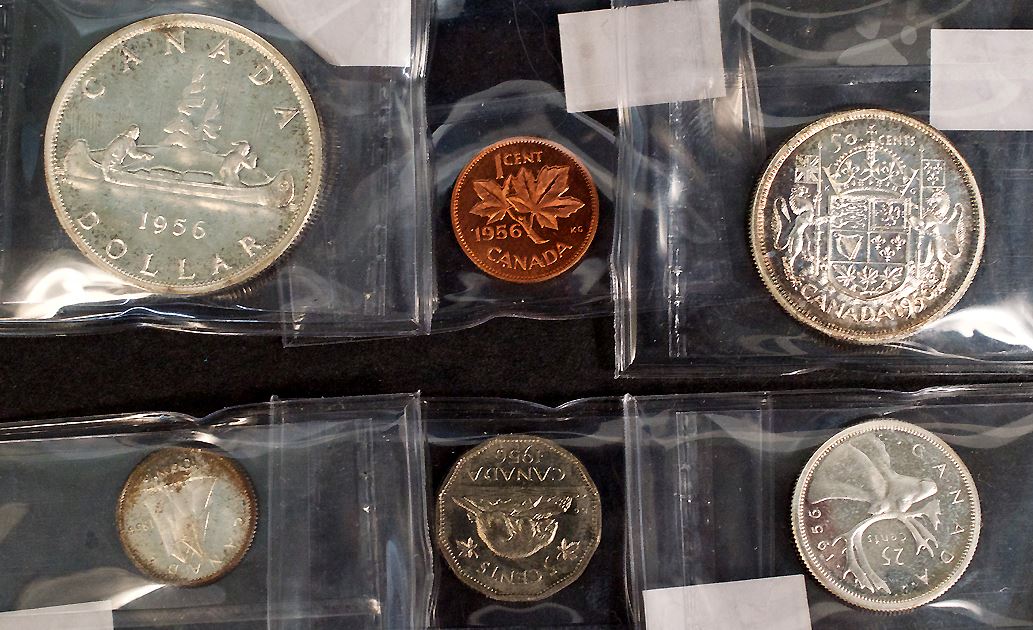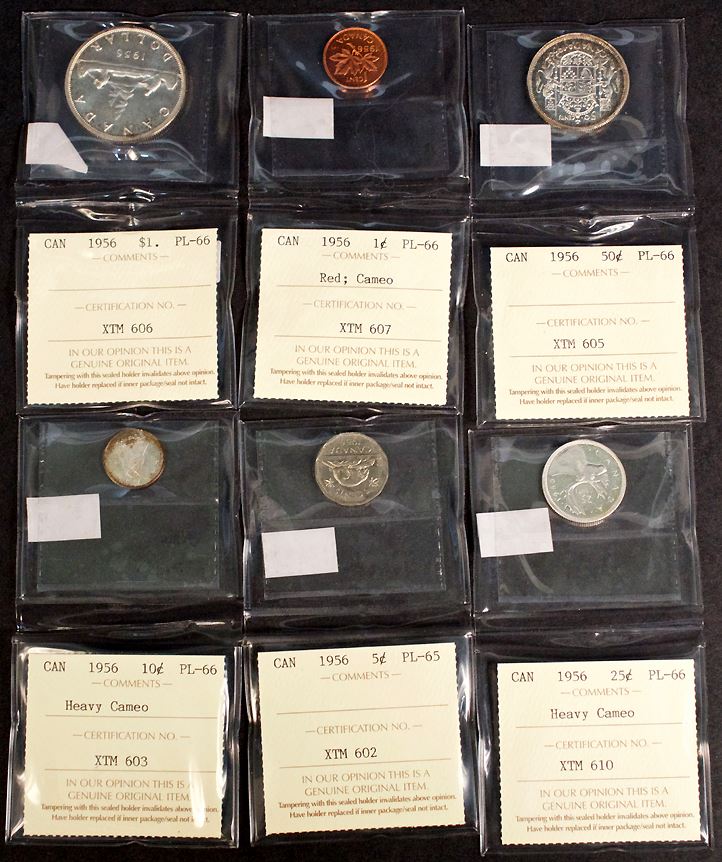 Prooflike Set, 1956, with all coins graded Gem PL, by ICCS: Cent, PL-66, Red, Cameo; 5 Cents, PL-65; 10 Cents, PL-66, Heavy Cameo; 25 Cents, PL-66, Heavy Cameo; 50 Cents, PL-66; $1, PL-66; Silver is white or lightly toned. A nice set.