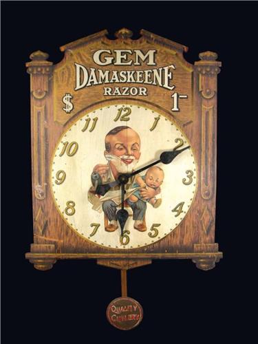 Gem Damaskeene Razor Wood Clock. Minor wood chipping at edges and scratches otherwise very good original condition. 21 X 28 inches.