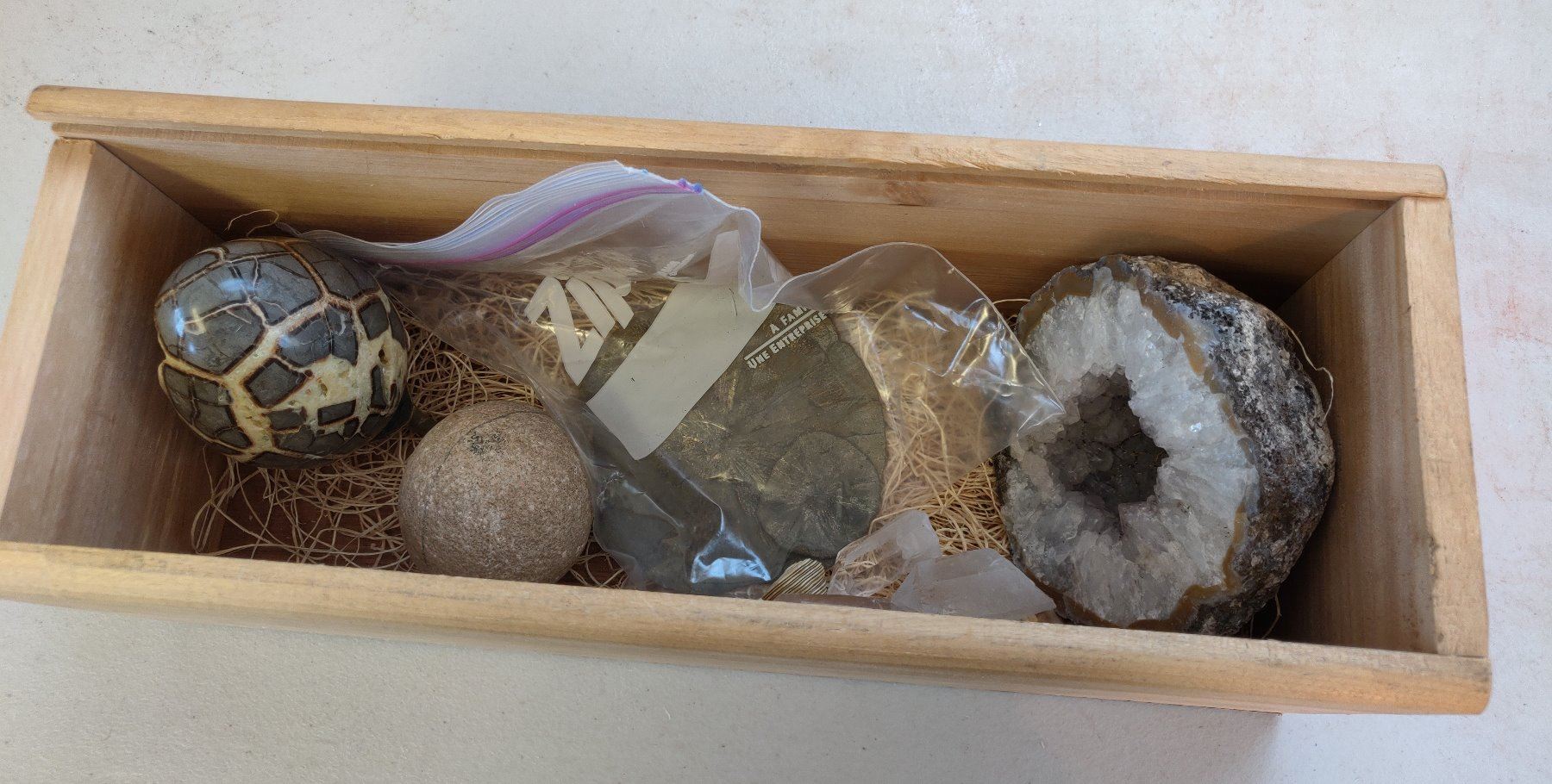 Gem & Mineral Collection, millions of years old. Made of pyrite sun disks, geode, crystals, the largest measures 4". USA, Africa. Box not included. Condition: Good, see images. Shipping: $26.50 w/insurance and signature, due to weight.